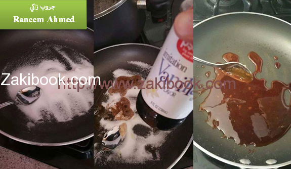 – نضع السكر على النار حتى يصير أشقر ثم نضيف اليه الفانيلا.