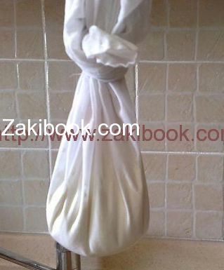 – اغلقي قطعة القماش جيداً, وضعيهي بداخل مصفاة, وضعي المصفاة فوق طنجرة, لكي يبدأ اللبن بتزيل الماء الفائض بداخله فيخرج من ثقوب قطعة القماش إلى المصفاة, ومن ثم إلى قاع الطنجرة, أو قومي بتعليق الكيس بمسمار أو علاقة وضعي صحن في الأسفل لكي نجمع به الماء الزائد, وتخلصي منه أول بأول.
