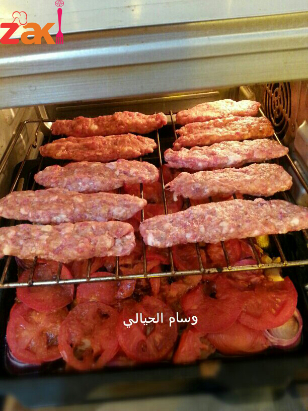 بعدين صفيت بصينيه بصل وطماطه حلقات مثل ماموجود بالصوره وخليت الصينيه تقريبآ قريبه من اسفل الاوفن(فرن)وبعدين شيشت الكباب واحاول اسحب قطعة الكباب بهدوء حتى لايتفلش شكلهاوطبعآ من اشييش الكباب ابلل ايدي بشوية ماي ومعجون. وبعدين صفيت القطع عالمشبك مال الاوفن مثل ماموضح بالصوره.