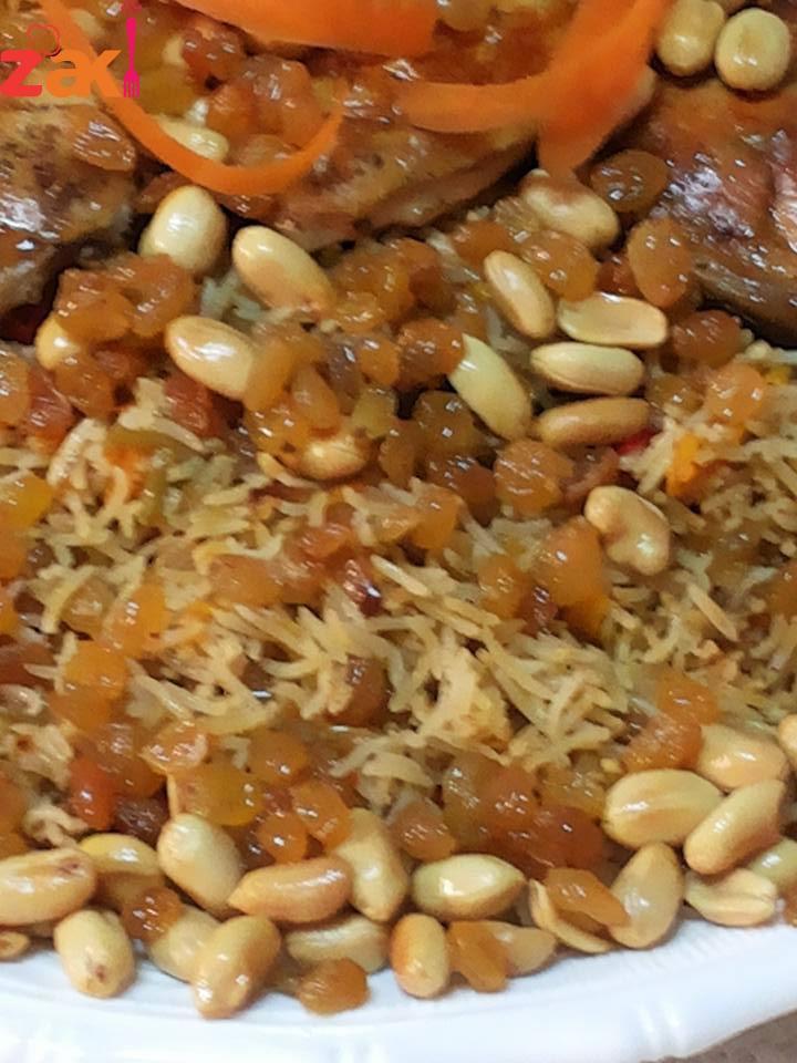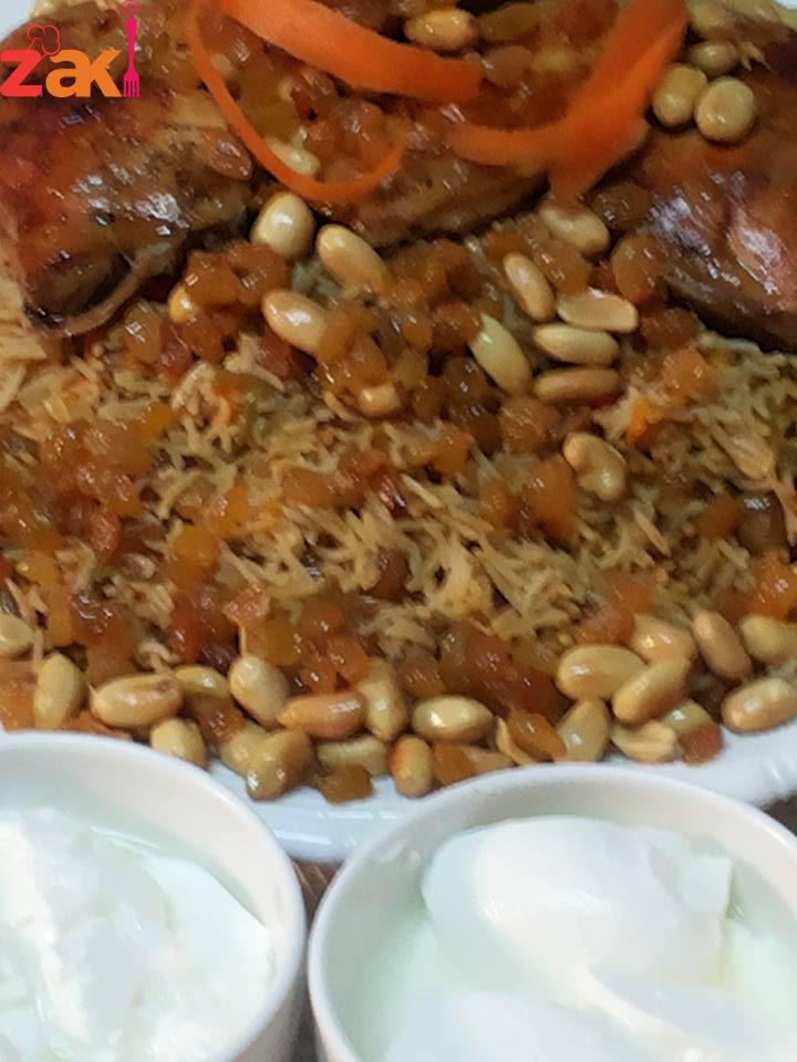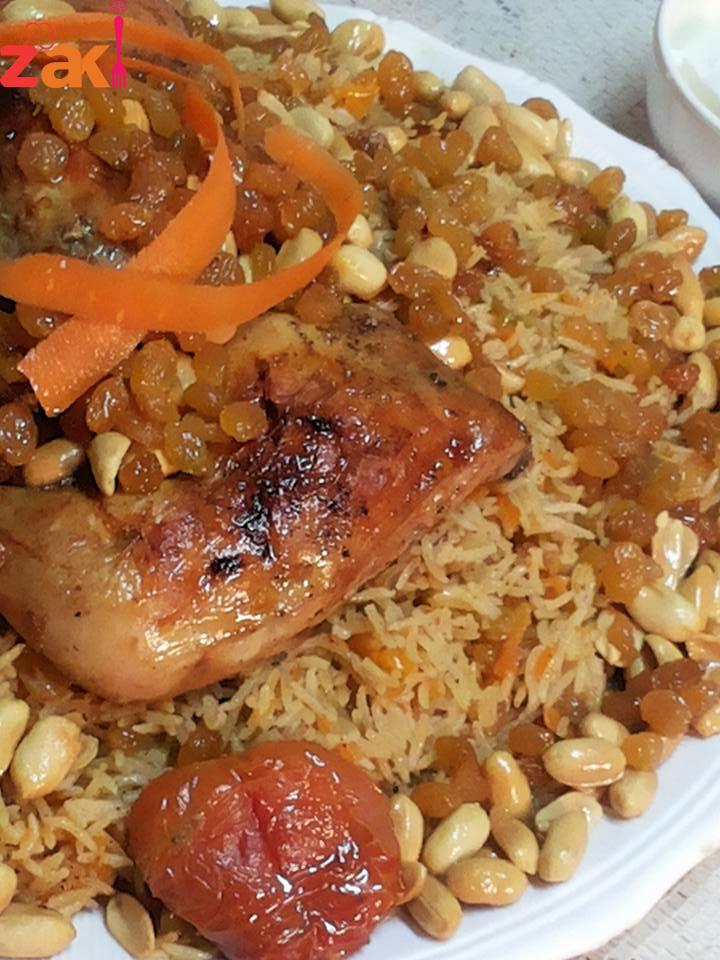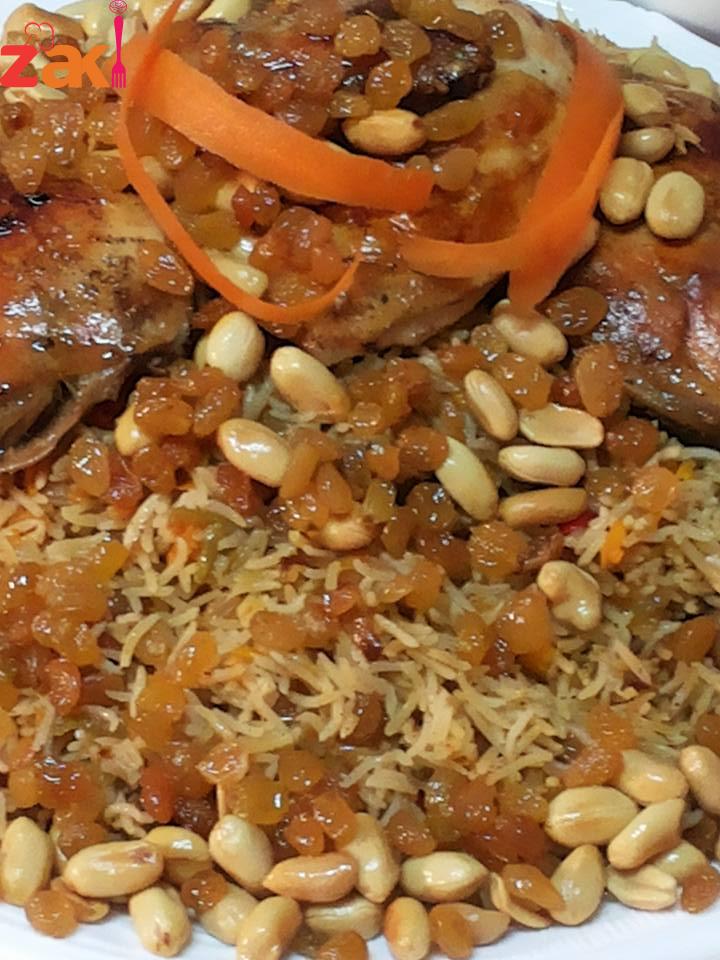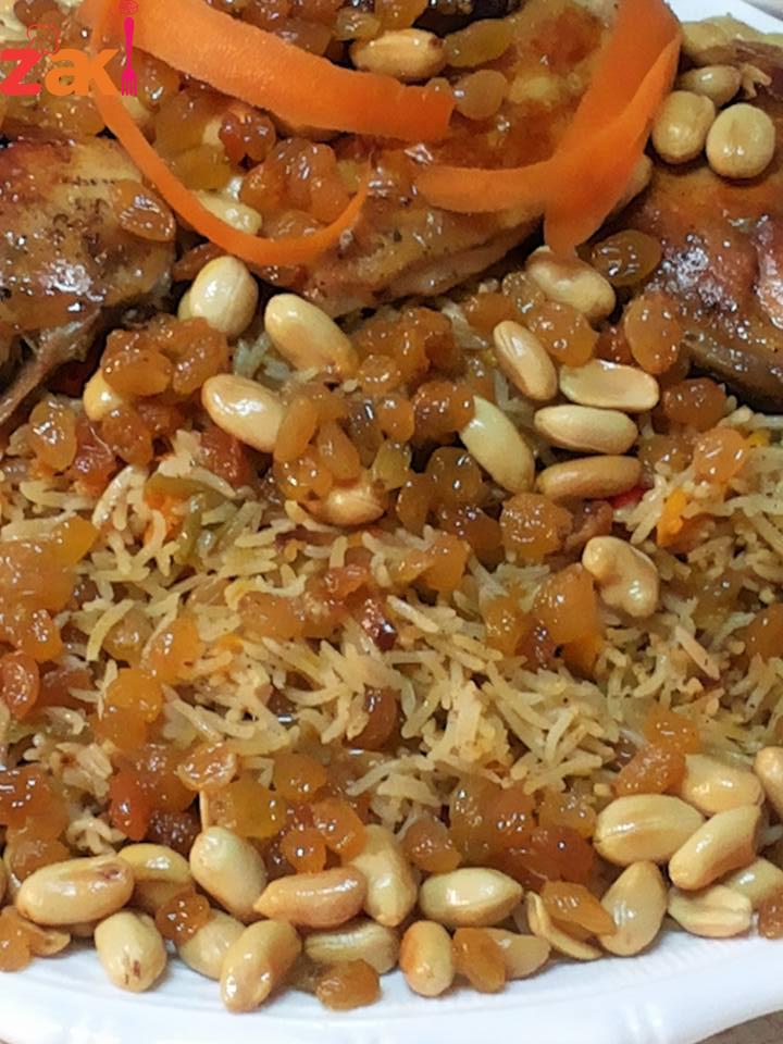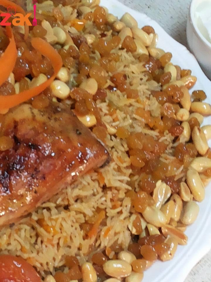 حمصي المكسرات ثم كوني ناقعه الزبيب بماء فاتر لمدة عشر دقائق وضعيه بعد المكسرات بعد تصفيته والما تشوفي الحب بدا ينفخ شيله وضعي الزيت الحامي فوق الارز في حال كنتي مسبقا محضره المكسرات احمي زيت وضعيه ع الارز ثم اسكبيه وزينه وهاي الاكله كثري الزبيب وصحتين وهنا ( مجدولين شرشير )
