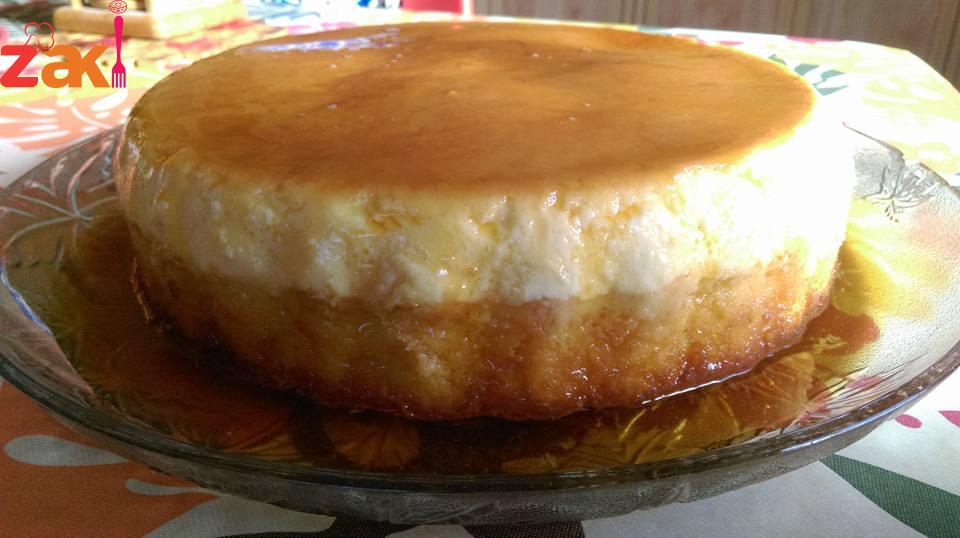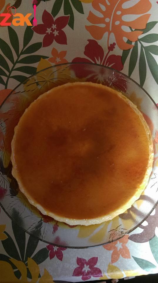 تخلط المقادير معاً حسب الترتيب ثم يضاف الخليط فوق الكراميل.