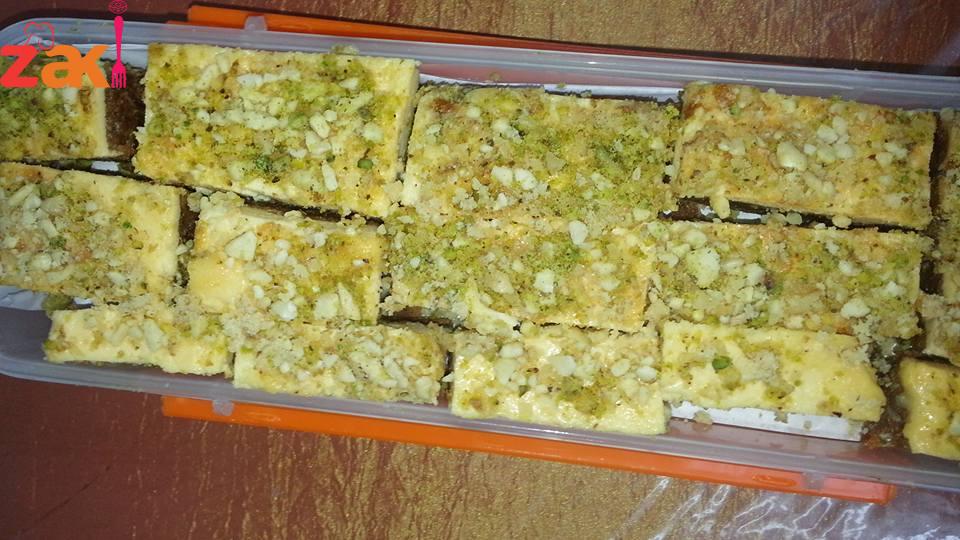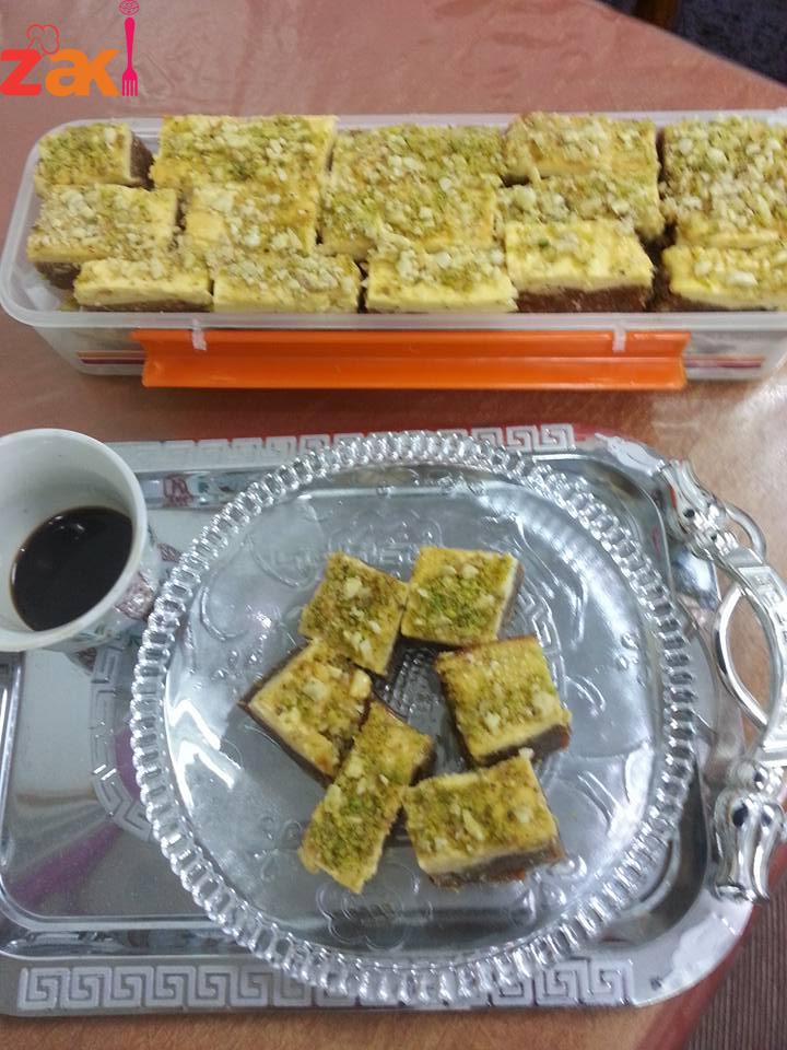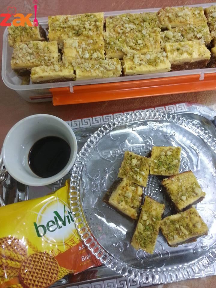 انا وضعت ملعقة صغيره من اليانسون وملعقة صغيرة من الشمر الحبه الحلوه وتعجن جيدا ونخلط معها البسكويت المطحون ثم نمده في بايركس ونضع فوقه الطبقة الثانية والى الفرن حتى تتماسك الطبقة الثانية يخرج ويرش بالمكسرات ويترك حتى يبرد تماما يقطع ويقدم مع القهوة وبالهنا …. الطعم رائع …..