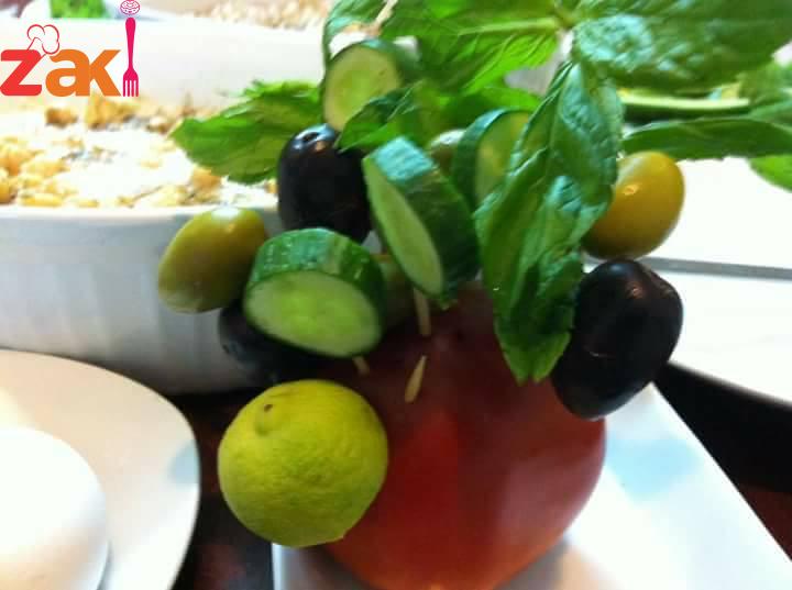 مع شجرة مقبلات زيتون اسود وخيار ونعنع أخضر ومخلل