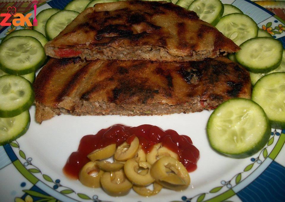 ثلاثة أكواب من الطحين. كوب من الماء الدافئ. ملعقة كبيرة من الخميرة. ملعقة كبيرة من السكر. رشة صغيرة كزبرة . رشة صغيرة كزبرة ربع كوب زيت مكوّنات الحشوة: مائتان وخمسون جراماً من اللحم المفروم. حبة بصل كبيرة. ملعقة صغيرة ملح. ملعقة صغيرة شطة. ربع ملعقة صغيرة فلفل أسود. قرنا فلفل أخضر. ملعقة صغيرة بهار مشكل. فصا ثوم. نصف ضمة بقدونس. حبة كبيرة طماطم.
