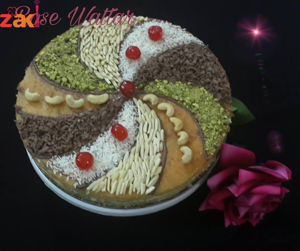 تخلط المواد الجافه معا ويضاف المواد السائله وتخلط تصب نصف الكميه ف القالب وتشوى من تحت إلى أن تحمر الجوانب