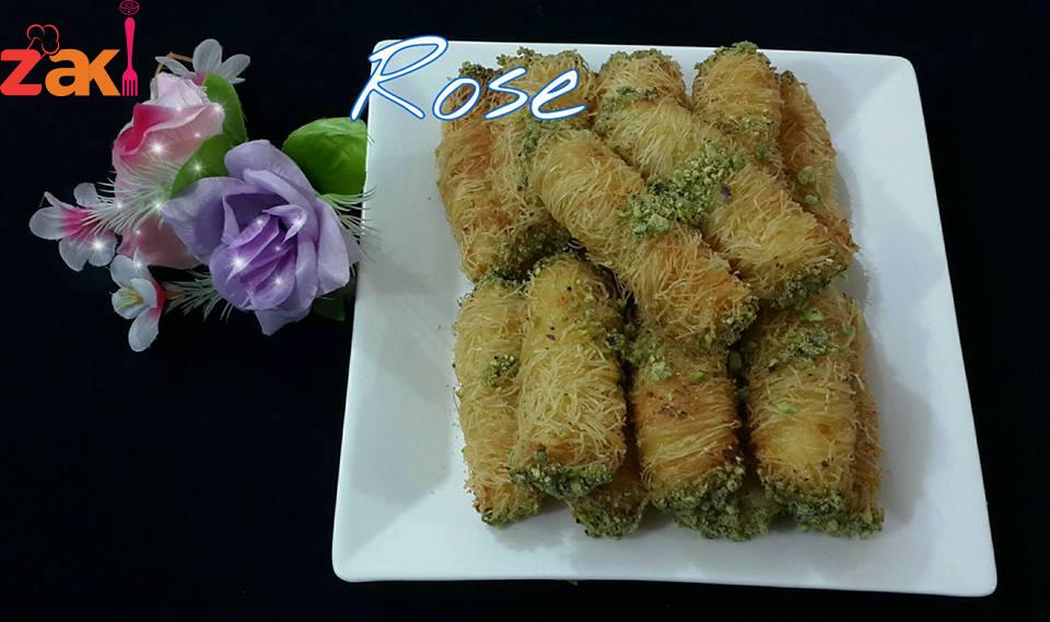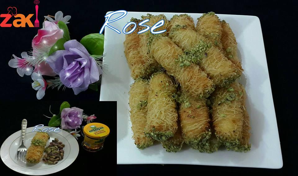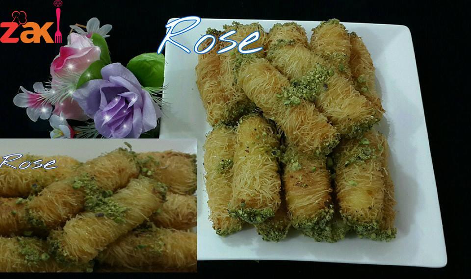 تمد الكنافه ع شكل اشرطه وتمسح بالسمنه وتوضع الحشوه ف الطرف وتلف ع شكل رول توضع ف مقلاة زيت وتوضع رولات الكنافه وتقلى وتترك إلى أن تحمر من تحت وتقلب ترفع وتوضع ف الشربات وتزين بالفستق