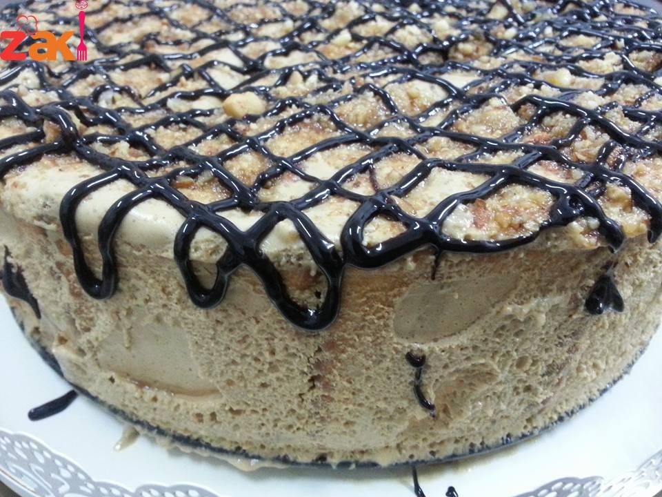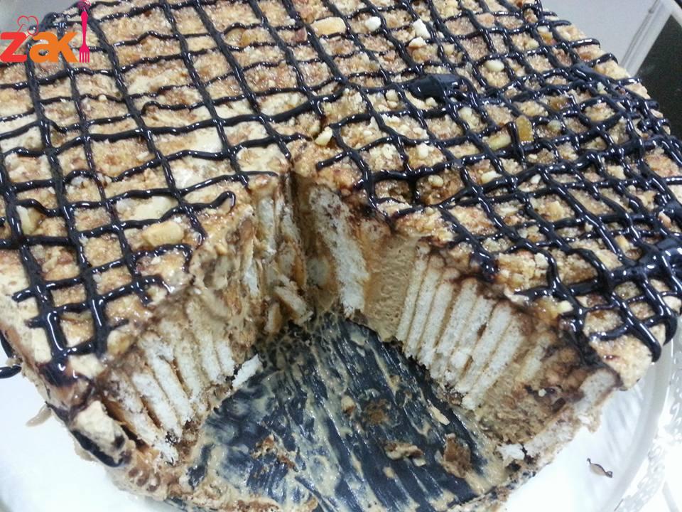 2 باكيت كريم بودرة, بتخفقيهم مع كاسة حليب بارد, وعلبة قشطة, وبتسخني ربع كاسة مي وبتذوبي فيها ملعقة نسكافيه وباكيت كريم كراميل, وبنضيفهم على خليط الكريمة