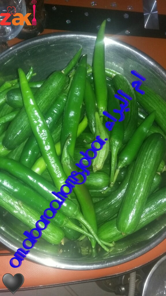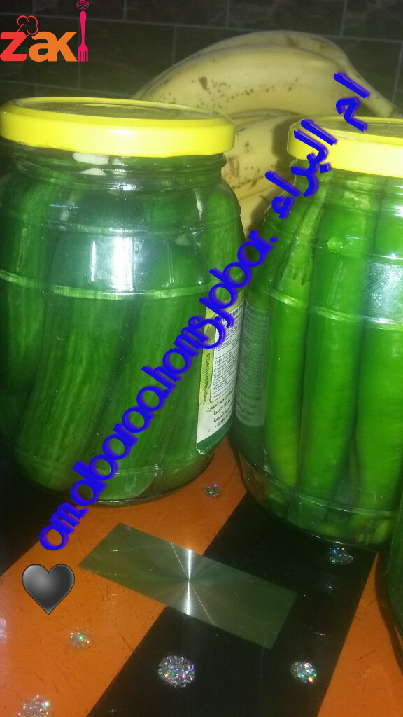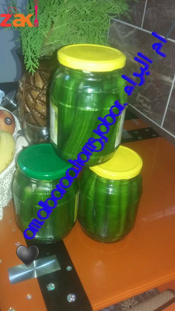منحط لملح ولخل وسكر بلمي ومندوبن ولخيار ولفليفه منغسلن منيح منجيب لمطربان يلي بدنا نحط فيه منرص لخيارلحال واذا بدنا منحط خيار وفليفله مع بعض بس نخلص منحط سنيه توم للمطربان مفرما ناعم وبعدا منحط لمي يلي جهزناها ومنتركه اسبوع بكون جاهز لا الاكل ? كل لترين ماء بدهن هاد لعيار من سكر وملح وخل يلي كتبتو سابقه