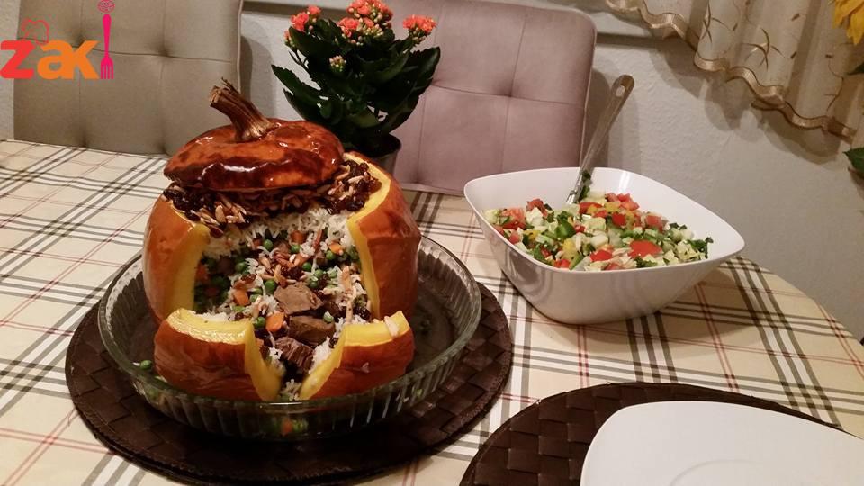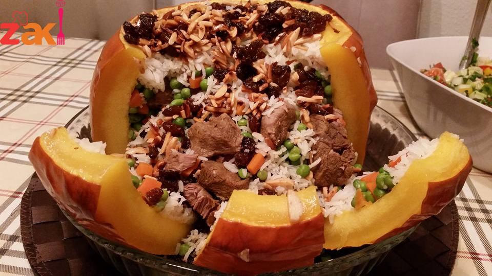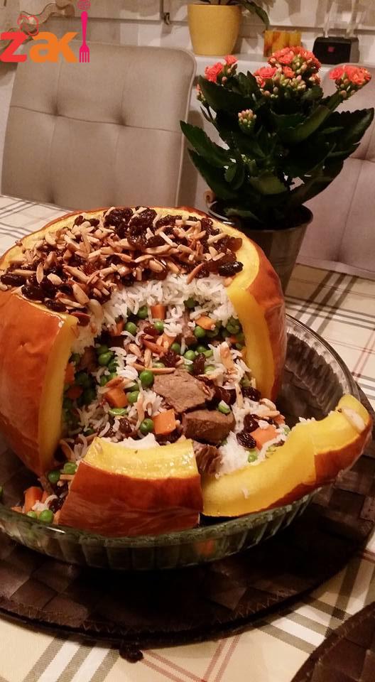 اول شي ضفت رز داخل القرعه طبقه بعدين طبقه بازيلا وجزر وبعدين لحمه شقف وهكذا لاخر القرعه ورجعت الغطاء ودهنتها زيت وبالفرن تركتها ساعه ونصف علي 200 درجة الحراره افحصي انها استوت بغرز سكين بالقرعه ادا دخلت بسرعه خلص بكفي وزينيها بمكسرات وزبيب محمصين .