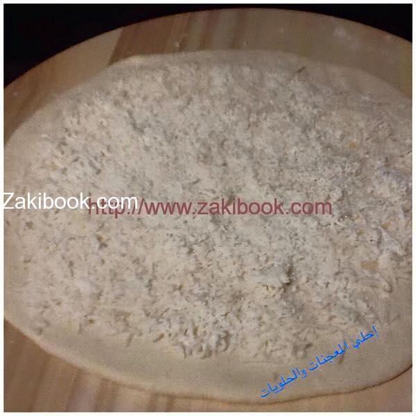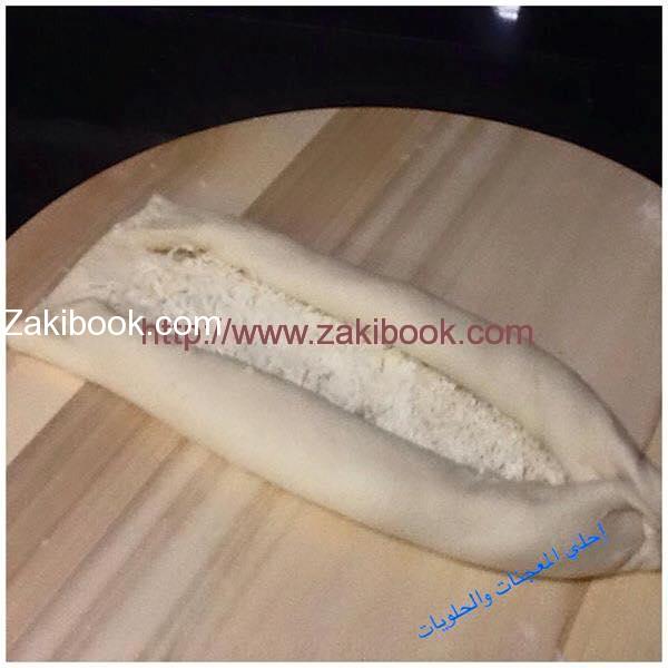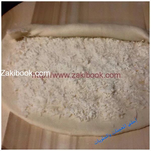 – ثم نفرد جبنه نجمع الطرفين علي شكل الرول ولا نصل الي المنتصف (انظري الصورة) وتوسع الدائرة باليد لوضع الحشو ثم نلحم الطرفين.