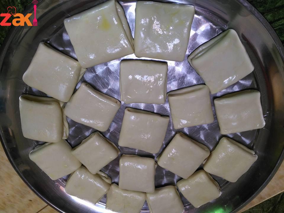 بعد هيك بترقوها دوائر وبتصفطوها مثل ورقة الفاين شوفو الصور كيف وبعد هيك بترقوها على شكل مستطيل وبتقلوها بشوية زيت زيتون وشوية سمنة الغزالين وصحه وعافيه
