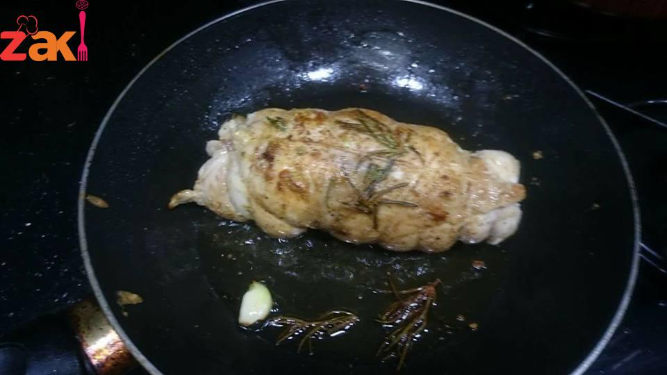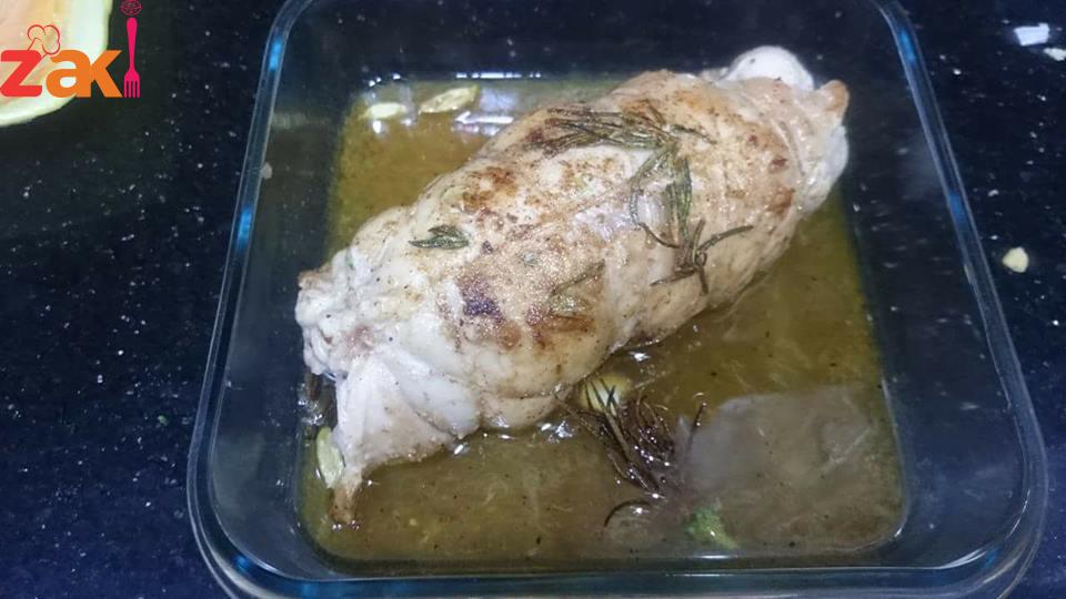 وبعدين لفيه وربطيه بالخيط وشوحيه في شويه زبة مع روز ماري وفصين ثوم وحطيه بالصنيه وكبي عليه شويه شربه يعني نص كاس