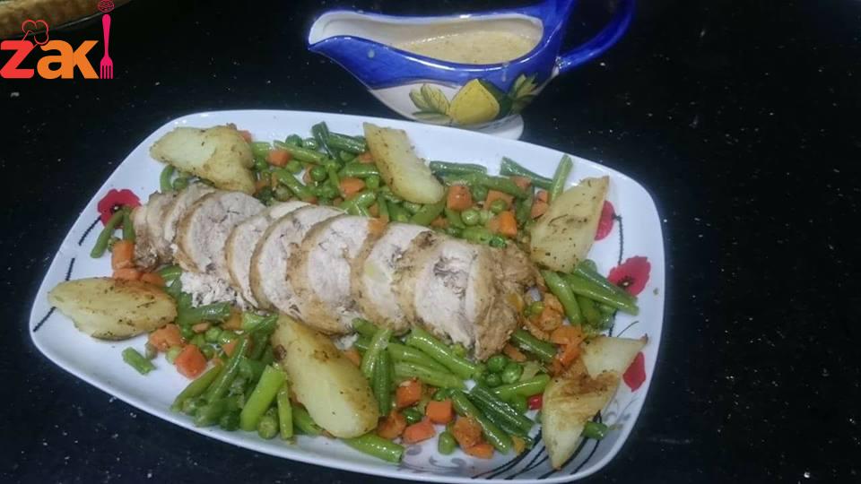 ولما يبرد قطعيه وقدميه مع الخضار او روز ومرق الي فضل معانا نصفيه وضفي عليه كريمه طهي ويتقدم بلهنا ع قلبك