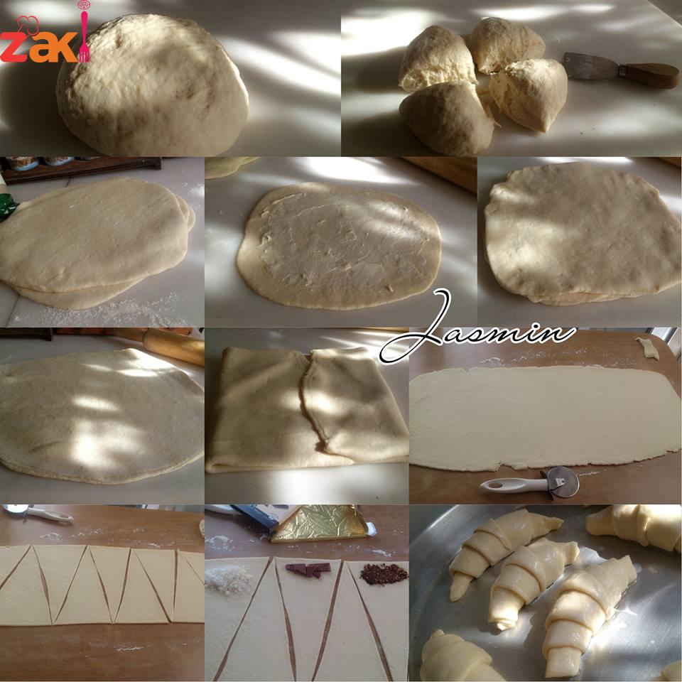 كل قسم من العجينة بنمده بشكل دائرة وبندهن اول دائرة بالزبدة وبنحط عليها القطعة التانية وندهنها بالزبدة وبنكرر التالتة والرابعة وبنمد الطبقات كلهن دائرة واحدة ونلفها بشكل مستطيل وبنسكره بشكل ظرف ونرجع نمدها ونرجع نلفها مجددا ونغلفها بنايلون وبنتركها بالبراد ربع ساعة لتجمد الزبدة فيها (كل ما مديناها ونلفها كل ما طلعت معنا طبقات هشة ومورقة اكتر) انا كررتها مرتين بس