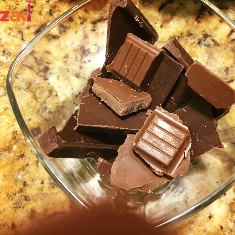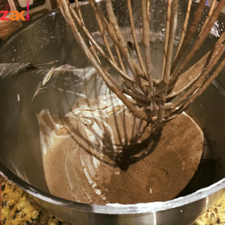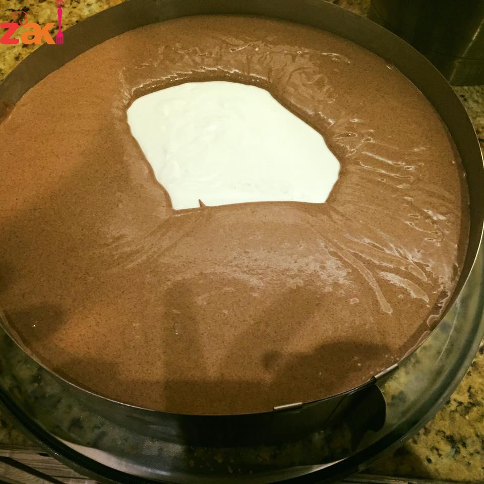يقسم الخليط إلى قسمين القسم الاول هو الابيض, والثاني يضاف عليه الشكولاتة مذوبة وكاكاو ونصف كوب ماء بارد جدا ويخفق جيداً