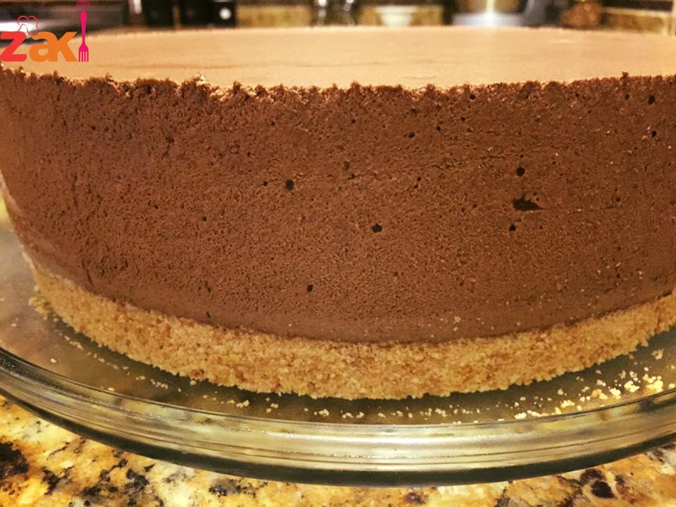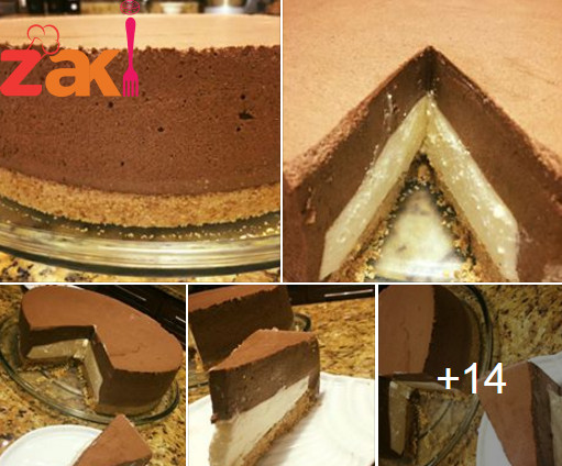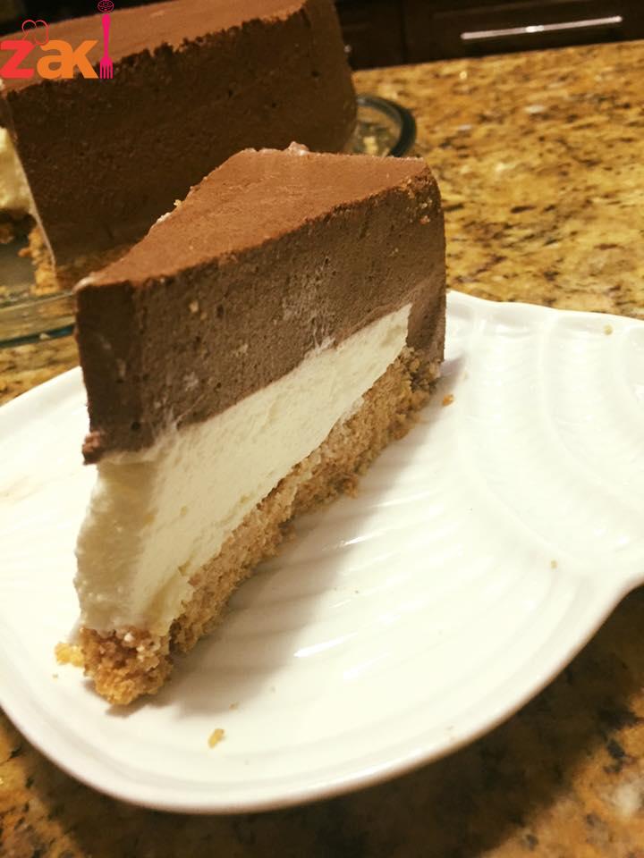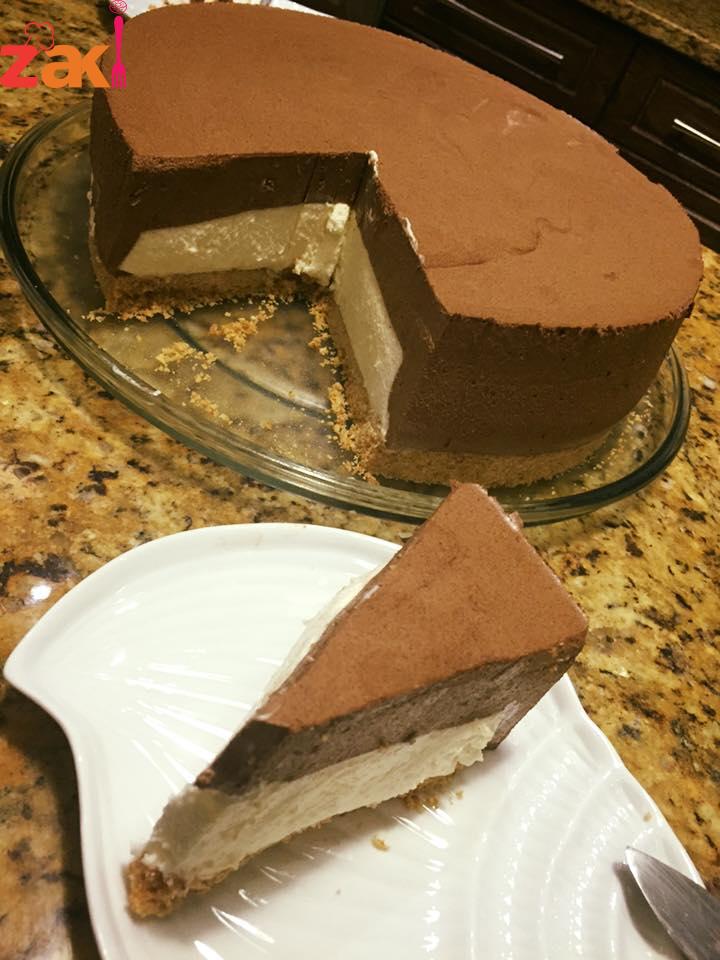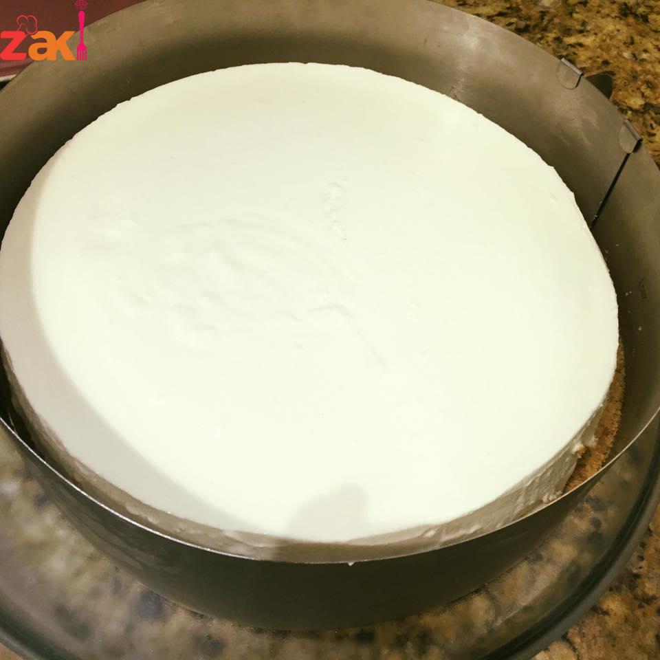 توضع فوق طبقة البسكويت حلقة في الوسط ويسكب الخليط الأبيض وتوضع في الفريزر ربع ساعة ونخرجه ونزيل الحلقة ويسكب خليط الشكولاتة فوق الخليط الابيض ويوضع في الثلاجة