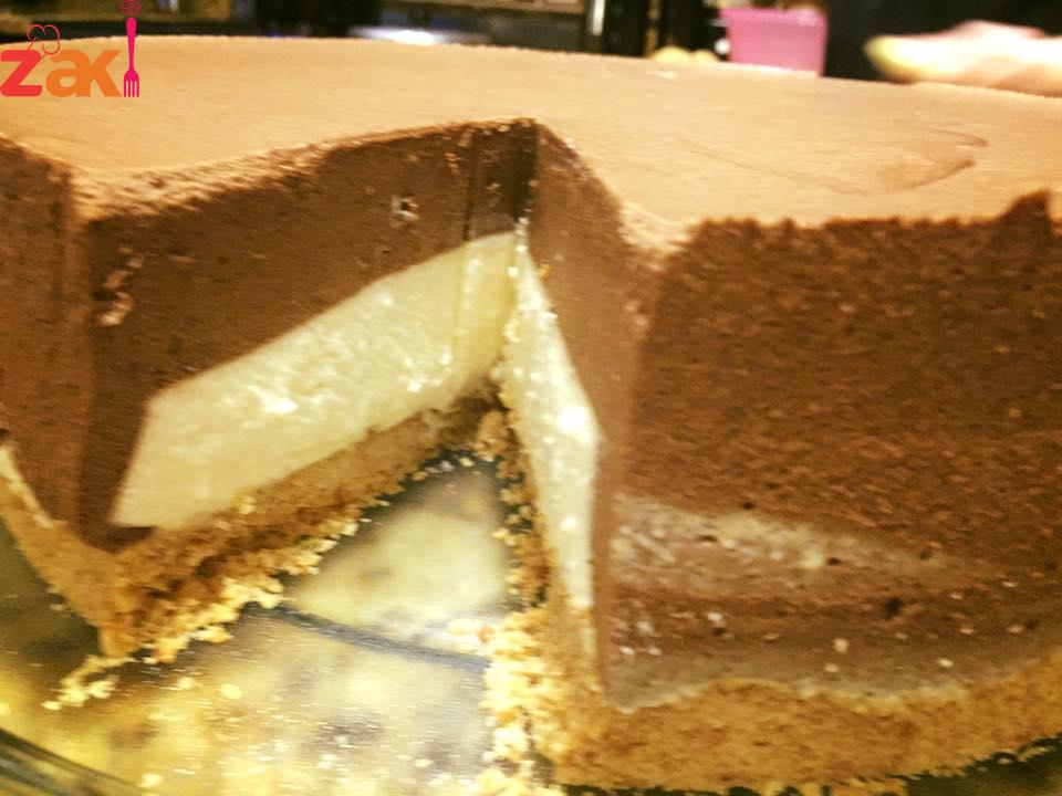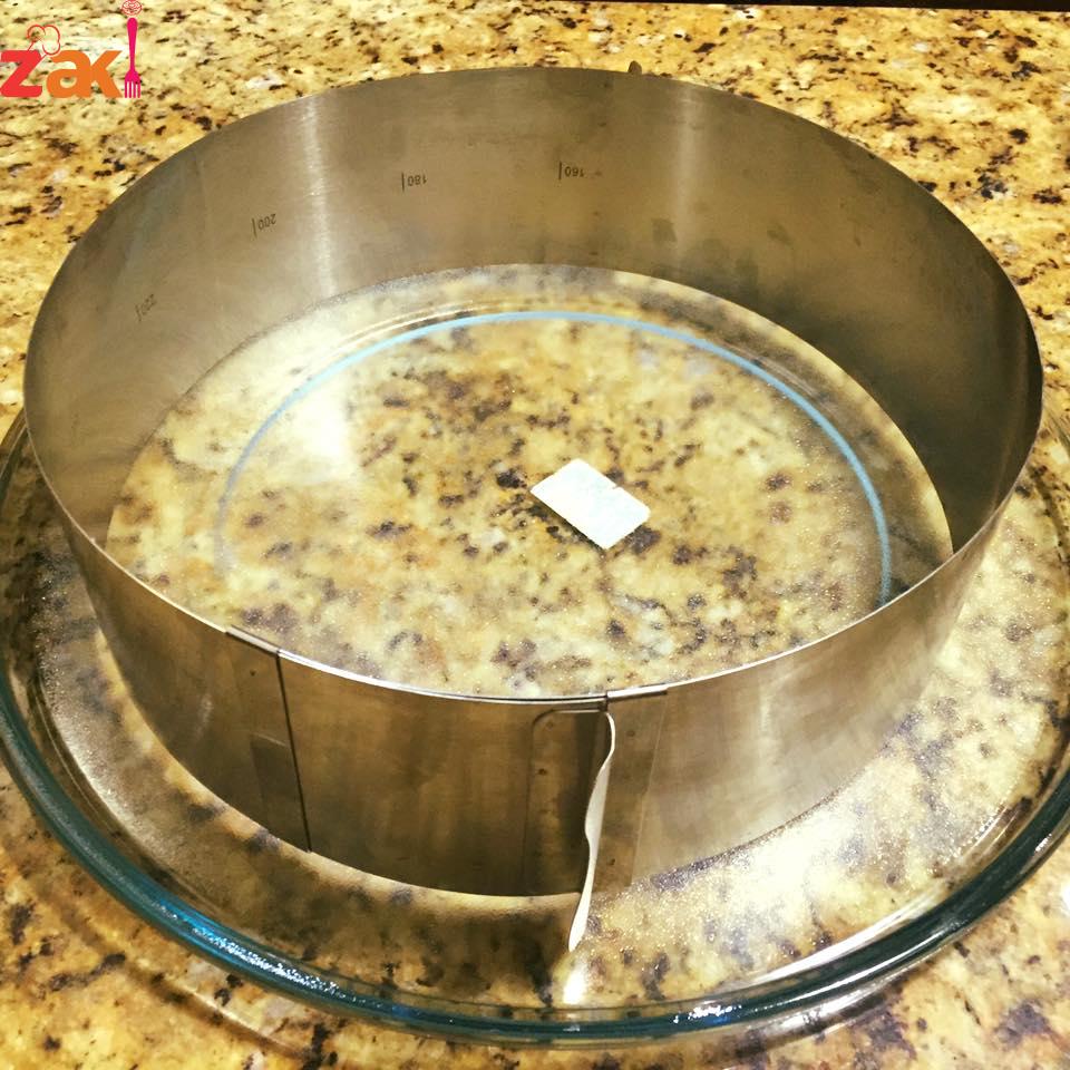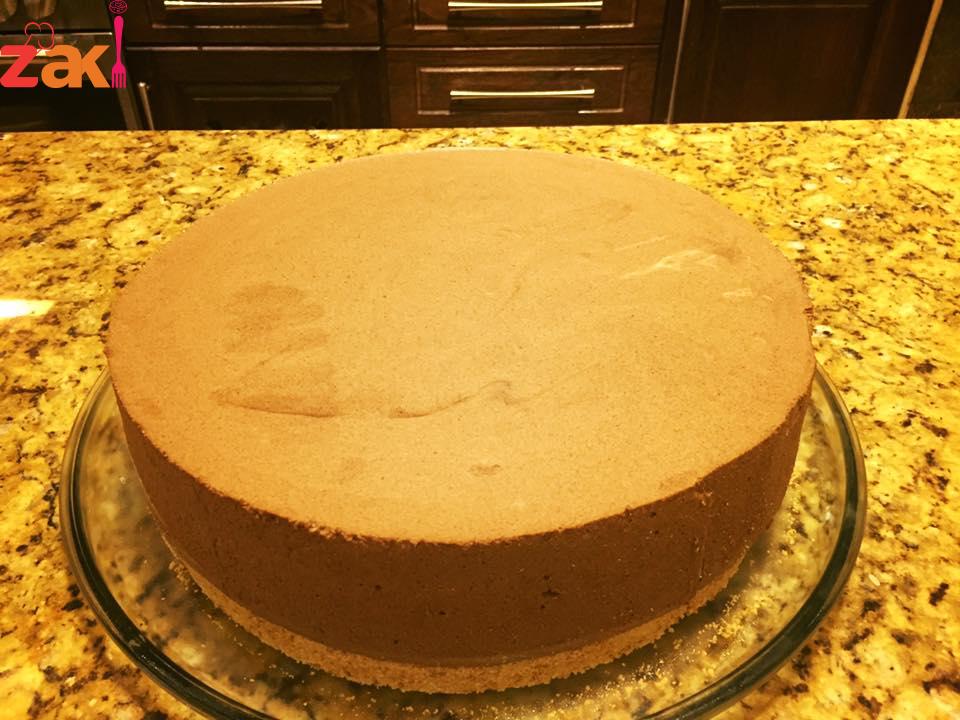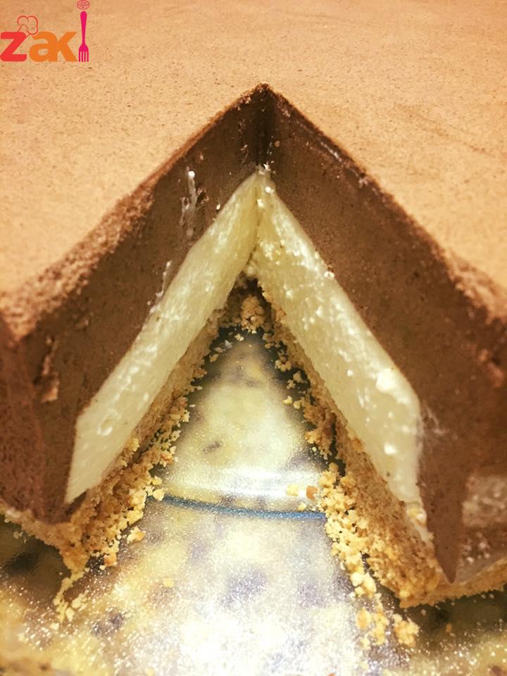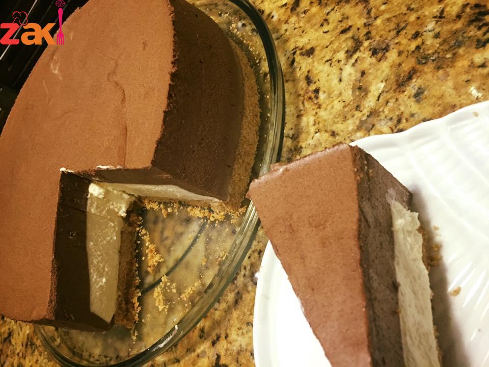 توضع فوق طبقة البسكويت حلقة في الوسط ويسكب الخليط الأبيض وتوضع في الفريزر ربع ساعة ونخرجه ونزيل الحلقة ويسكب خليط الشكولاتة فوق الخليط الابيض ويوضع في الثلاجة