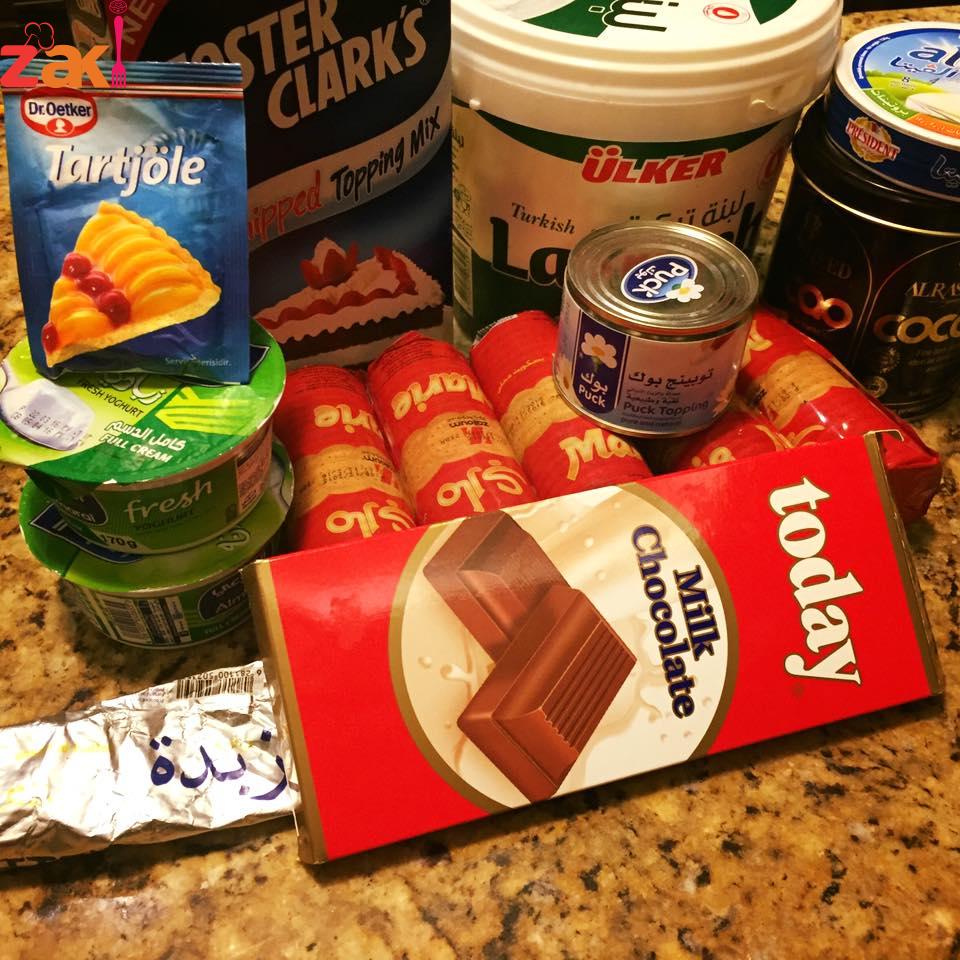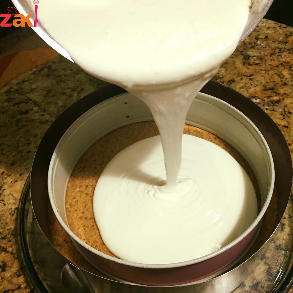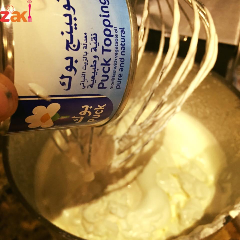 ومن ثم يضاف الزبادي والسكر واللبنة والجبنة والقشطة والحليب البادور مع استمرار الخفق وبعد يضاف الجيلاتين