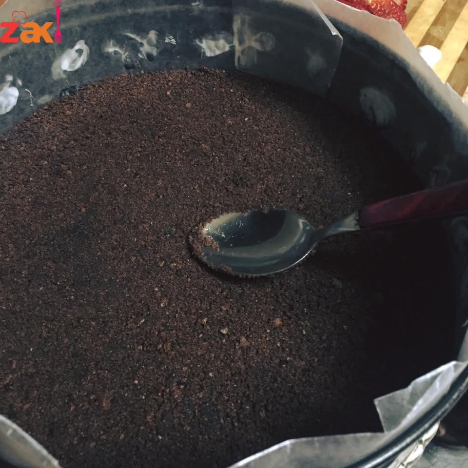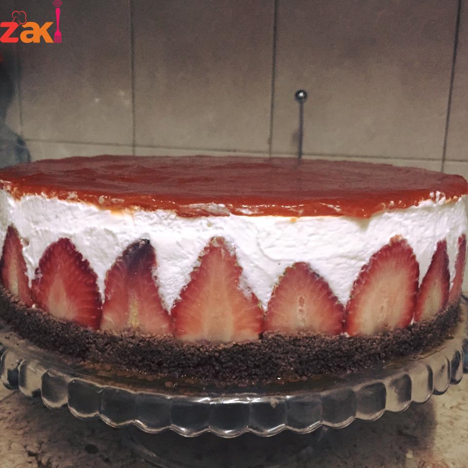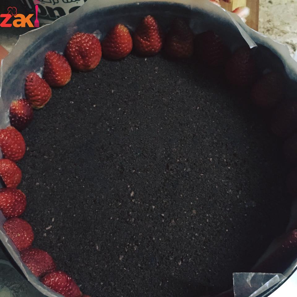 أولا يتم تكسير البسكويت وتسيح الزبدة وتحريكهم مع بعض ووضعهم في صينية التشيز ورصهم في الاسفل, ثم وضع الفروالة أنصاف على جوانب الصينية