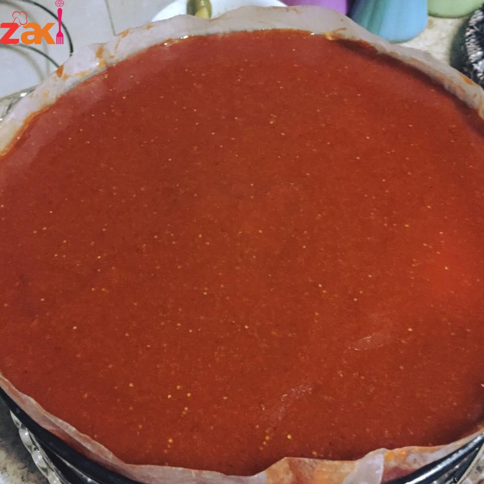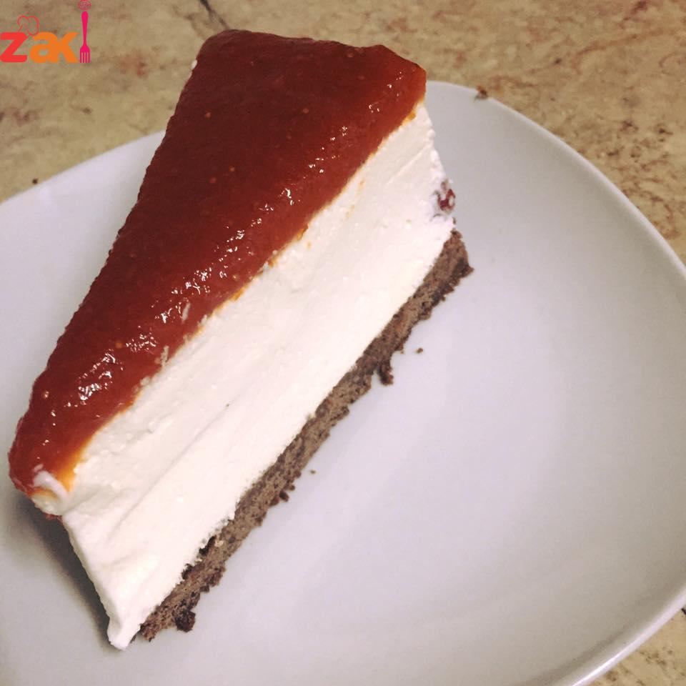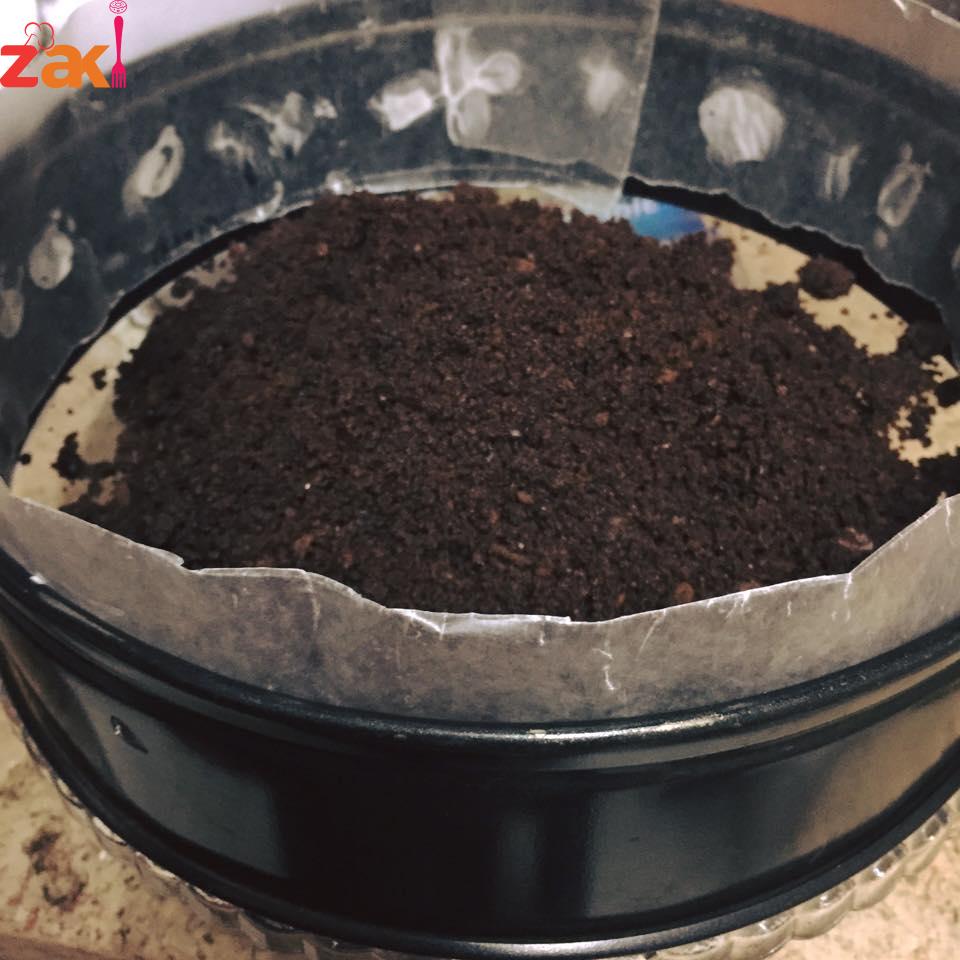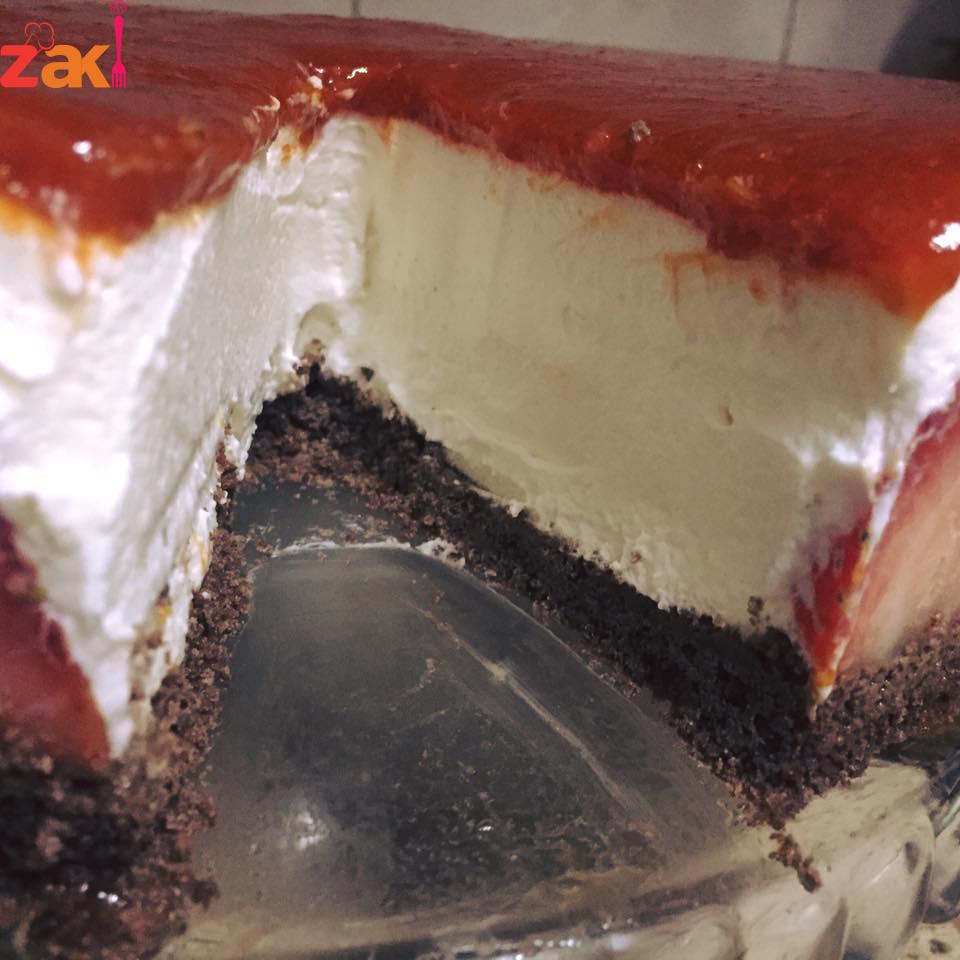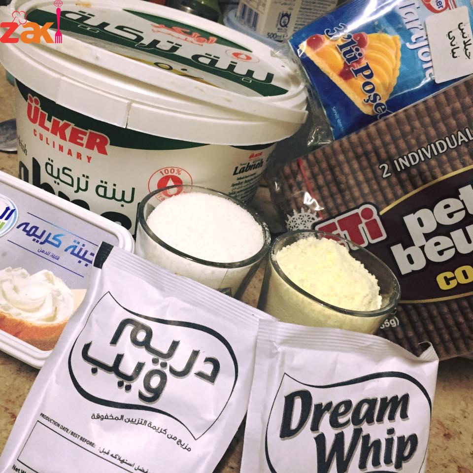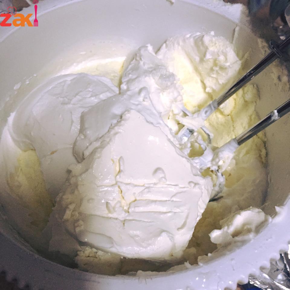 ثانياً خفق الكريمة مع كاسة ماء بارد جدا حتى يتضاعف الحجم ثم وضع السكر ويستمر الخفق ومن ثم الحليب والجبنة واللبنة واخر شي نضع الجيلاتين بس لازم الجيلاتين يكون منقوع في ماء ساخن نصف كاسة ماء ساخن ويستمر الخفق حتى تتجانس جميع المقادير وتصبح ملساء ثم يوضع فوق طبقة البسكويت, وفورا على الثلاجة