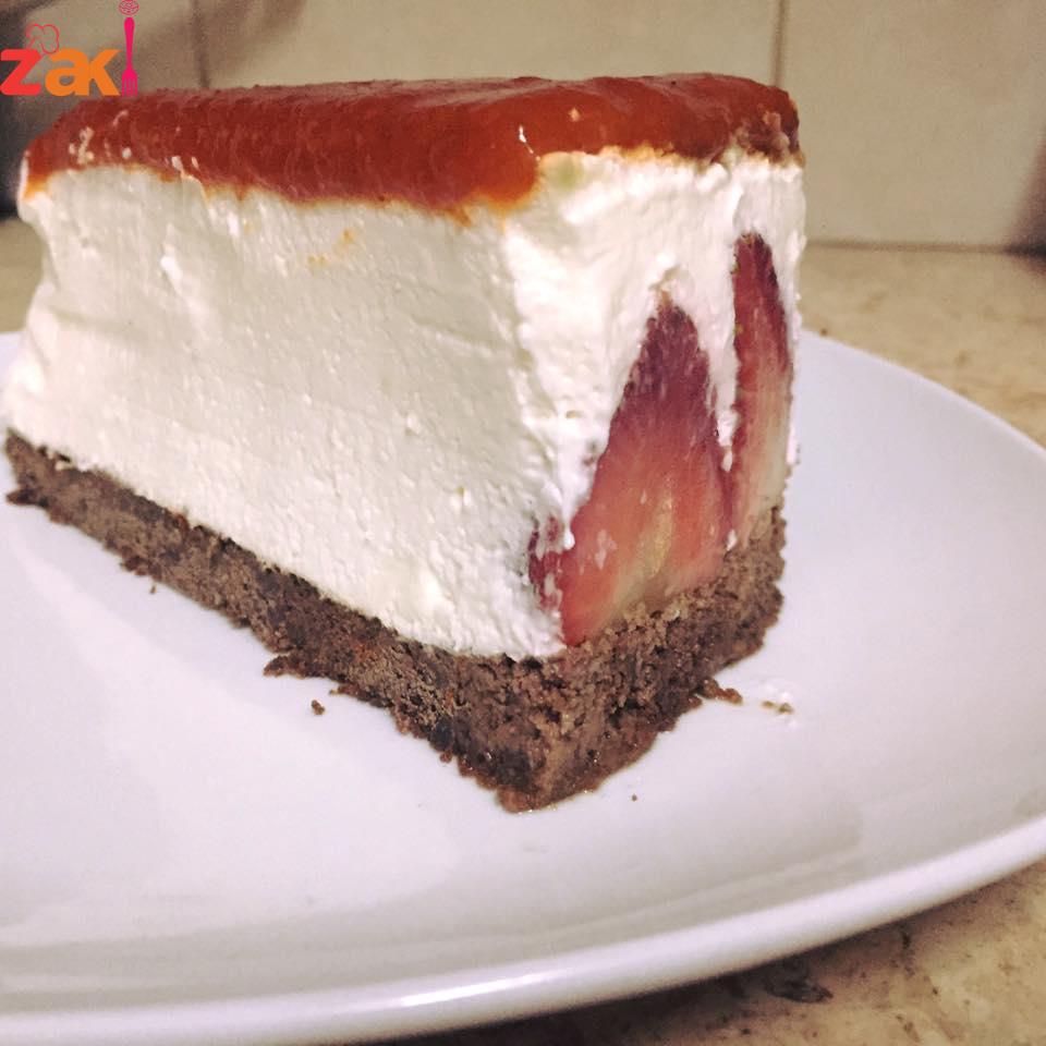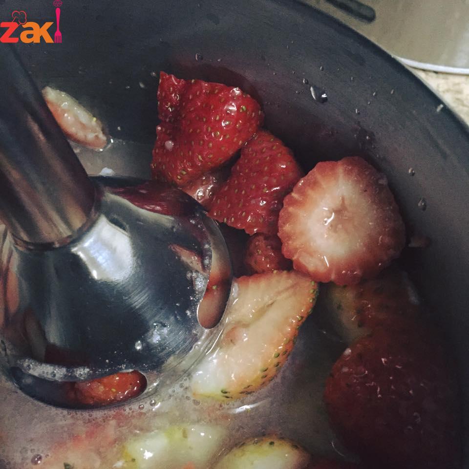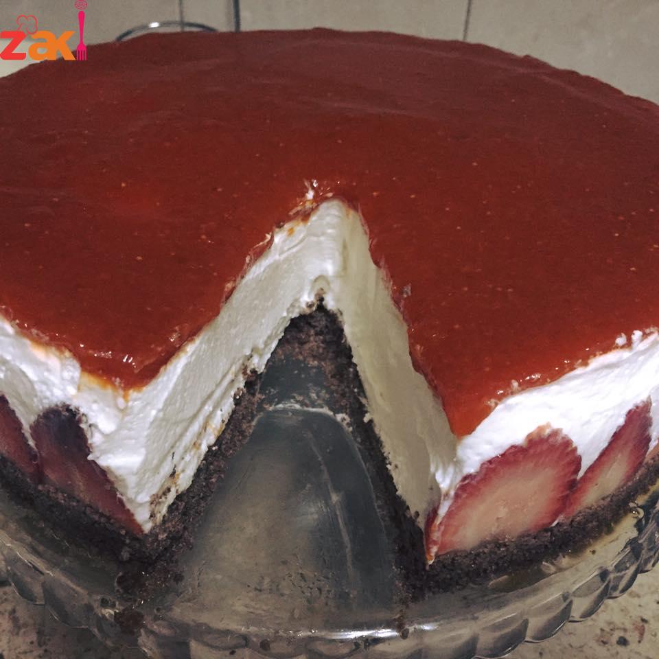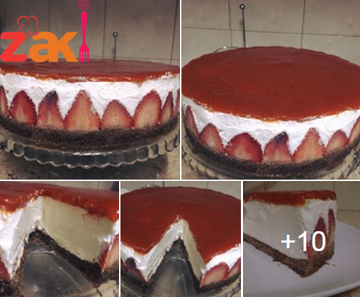 اخر طبقة في طنجرة صغيرة نضع فراولة ونصف كوب سكر وكوب ماء وملعقة جيلاتين ونوطي النار عليهم ونخليهم على الغاز حتى يغلي, بعد ما يغلي نخلي المزيج يبرد شوي, ونديرهم فوق خليط التشيز كيك الأبيض وفورا على الثلاجة لمدة يوم كامل, وصحتين وألف هنا.