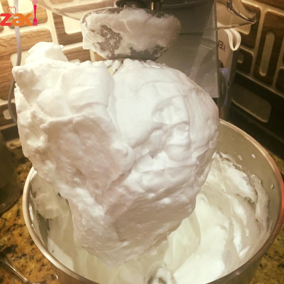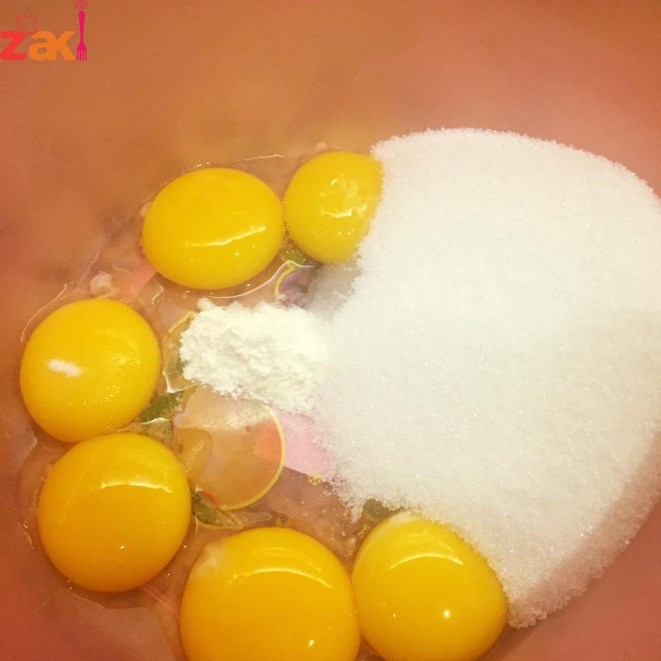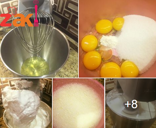 يتم فصل الصفار عن البياض يخفق البياض مع رشة الملح ونصف معلقة خل ابيض ويخفق حتى يصبح البياض ابيض جداً ونافخ جداً في وعاء ثانييخفق الصفار مع السكروالفانيلا جيداً حتى يصبح لون الصفار اصفر فاتح وكريمي وبعدين يضاف الزيت مع الخفق المستمر ومن ثم الماء الدافئ ويتم الخفق ١٠ دقائق ومن بعد يضاف خليط الصفار على البياض ويخفق ببطئ ببطئ حتى لا يهبط البياض ويتم تنخيل الطحين والنشاء والبكنج باودر مع بعض ويضاف الى المزيج بالتدريج والتحريك بمعلقه سلكون او خشبيه من الأسفل الى الأعلى وتدعم الصينيه زبده جامده ويسكب الخليط ويخبز على درجة حراره ١٥٠ في وسط الفرن لمدة ساعه