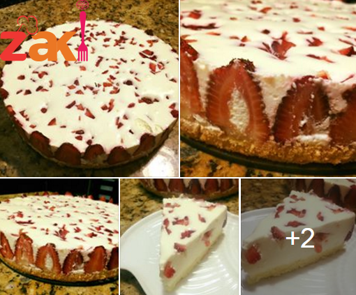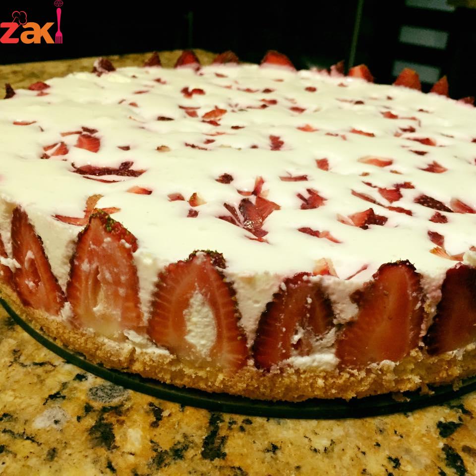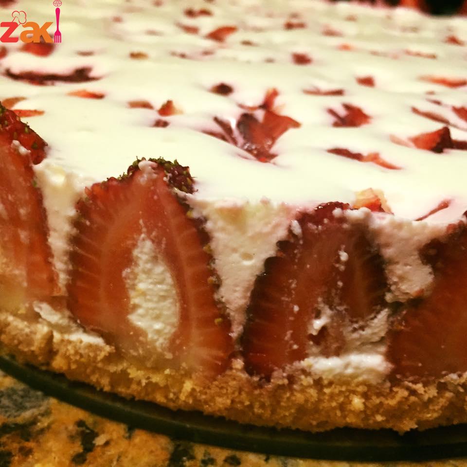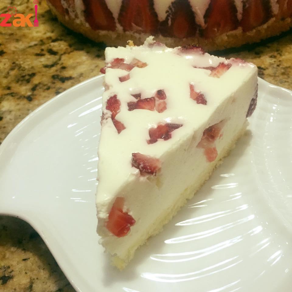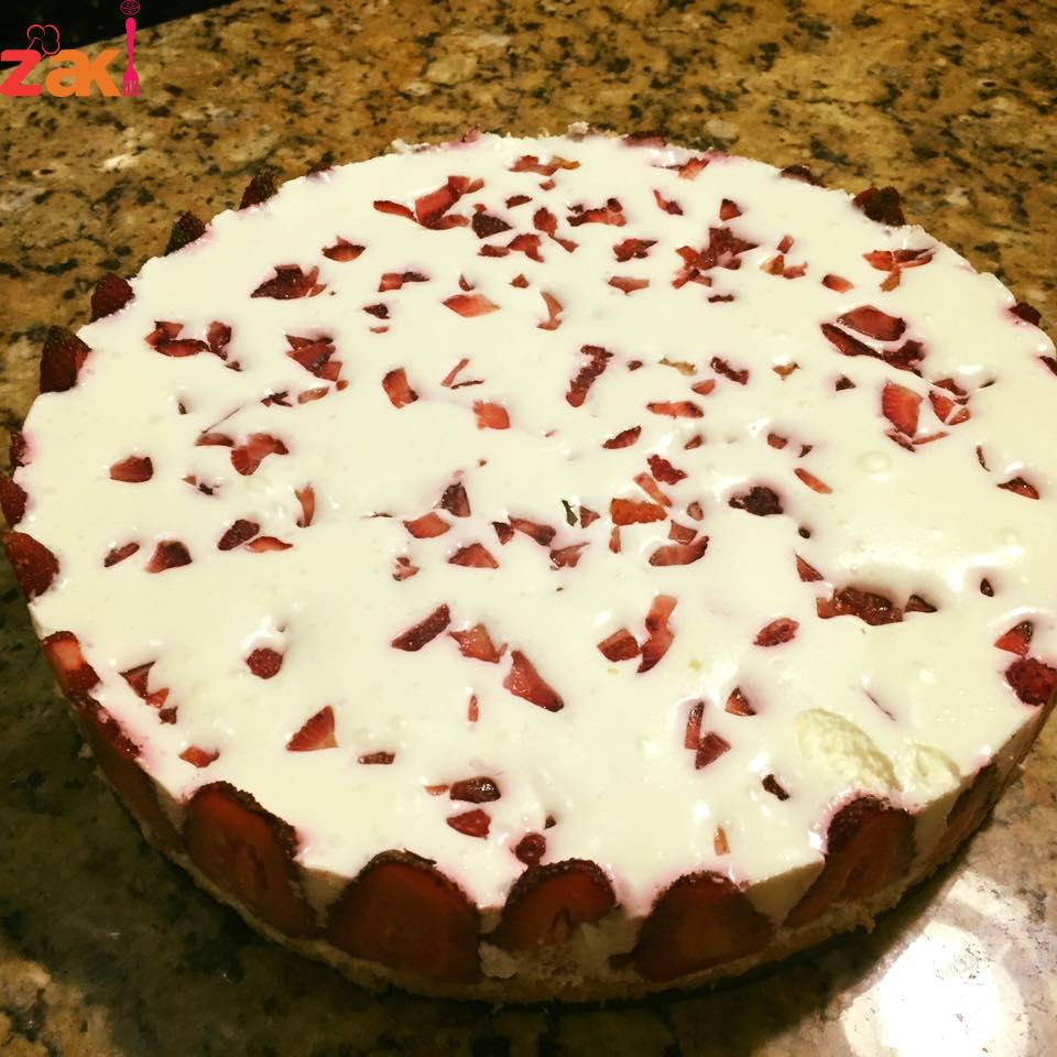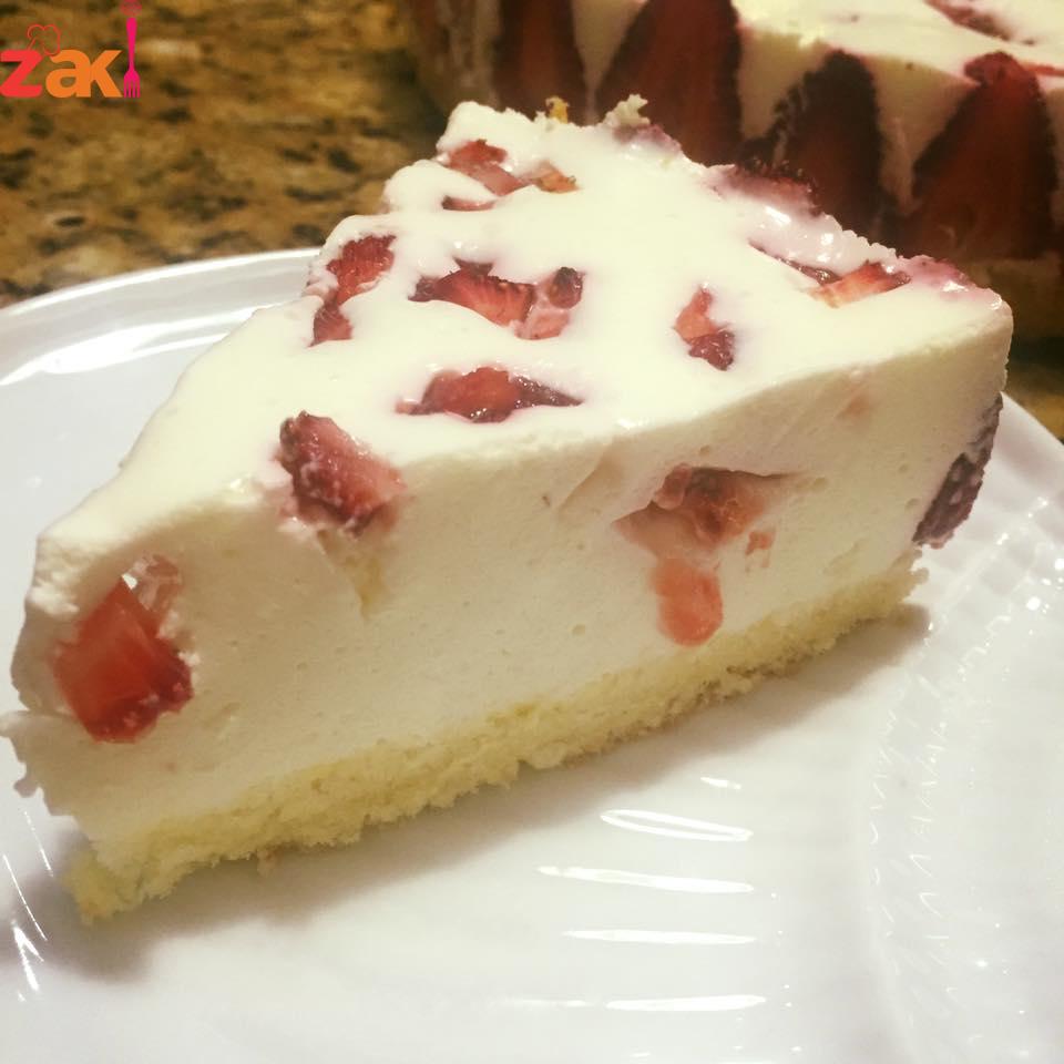 اولا يتم خفق الكريمه في كوب ماء بارد حتى يتضاعف حجمها ومن بعد يضاف السكر مع الخفق المستمر والحليب الباودر والجبنه والبن الزبادي والقشطه واخر شي نضع الجلاتين ونخفق قليلاً ومباشره بديرب فوق الكيك وهون بقطع فراولة قطع صغيره وبرميها على سطح الموس وعلى الثلاجه اقل شي اربع ساعات