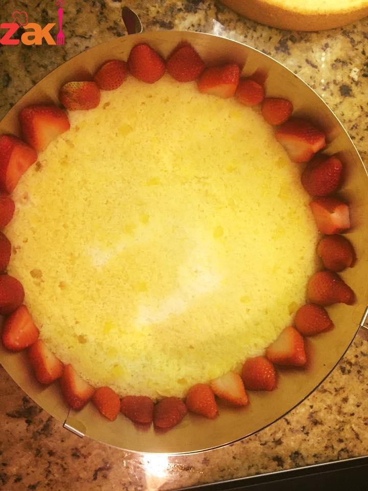اول طبقه كيك إسفنجي فانيلا في قالب التشيز بقطع فراولة أنصاف وبصفها على اطراف الصينيه