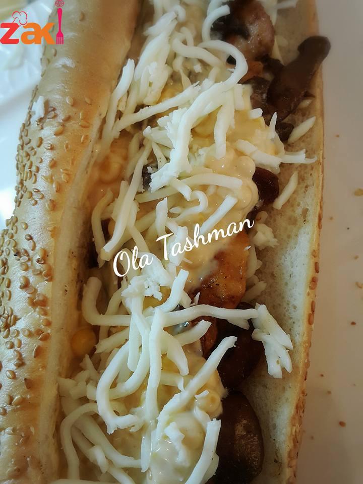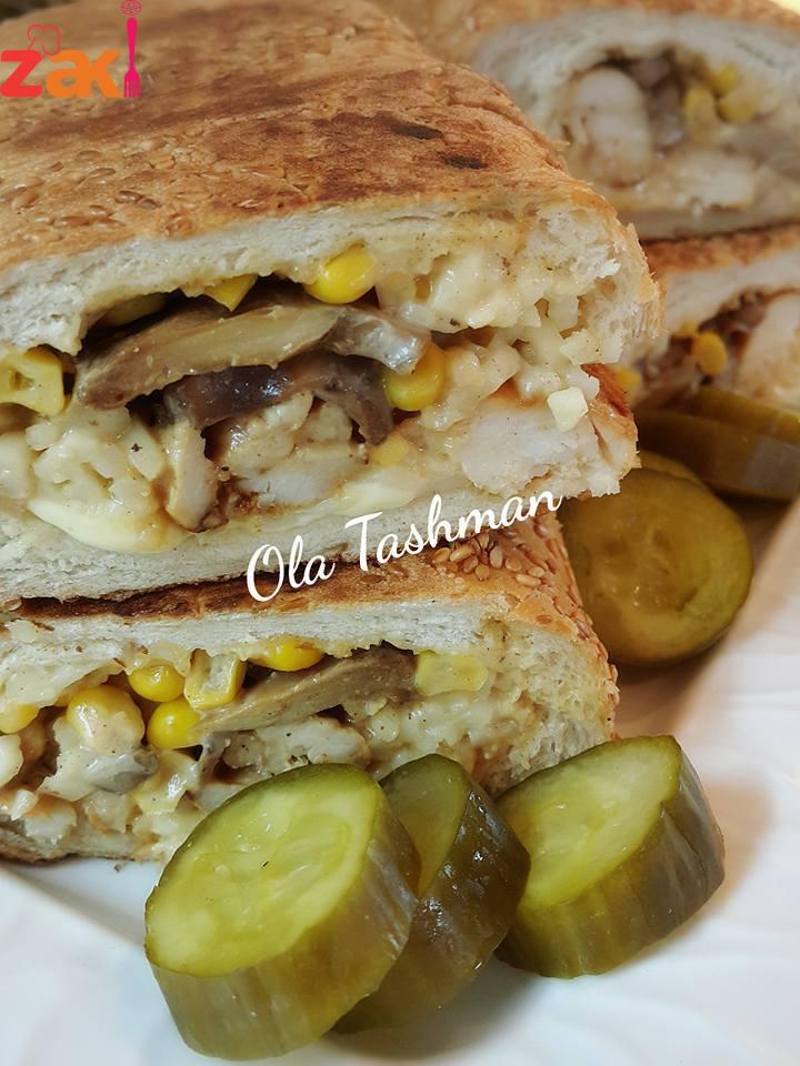 بنجهز الساندويش وبنحط جبنة الشيدر وجبنة الموزاريلا وبنحط الدجاج والفطر وخلطة المايونيز وبنسخن الساندويش على الشاوية وصحتنين وهنا
