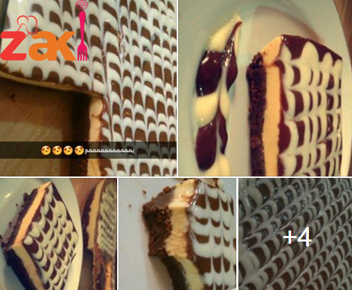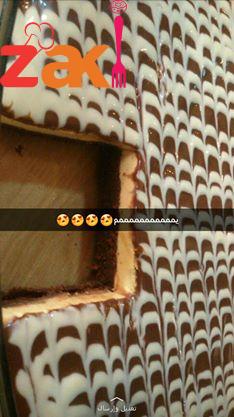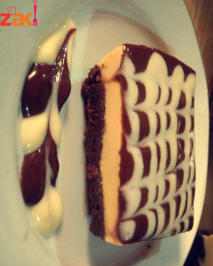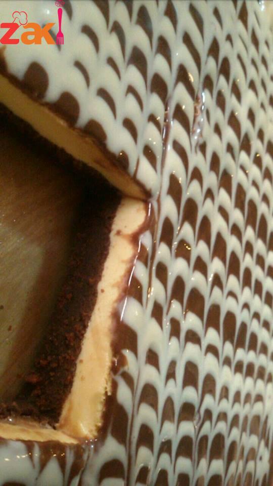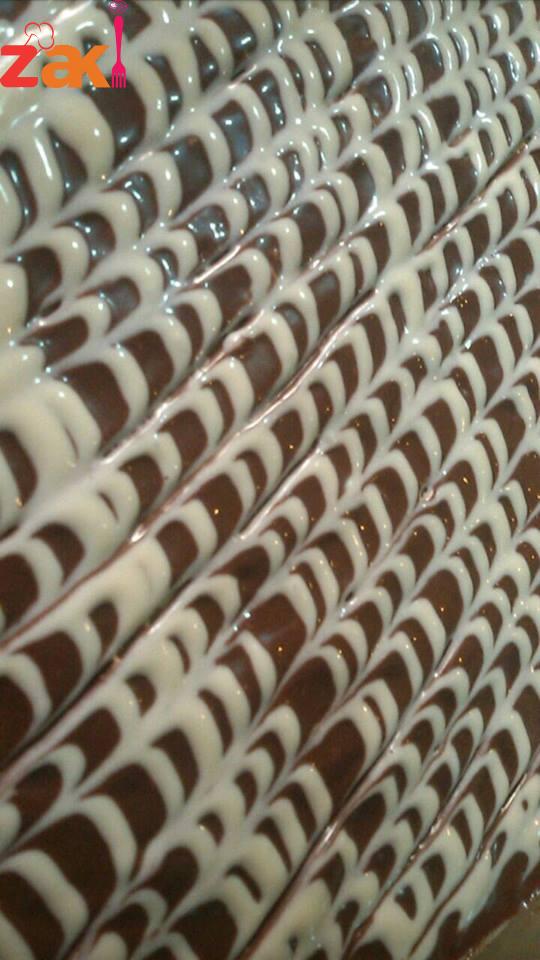 شغلي الخلاط وبعدين بنزل نصف كاسة زيت ليصير سميك وبندهن وجه الحلو, وبنعمل خطوط بالصوص الأبيض.