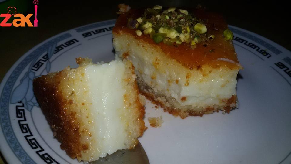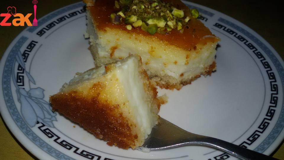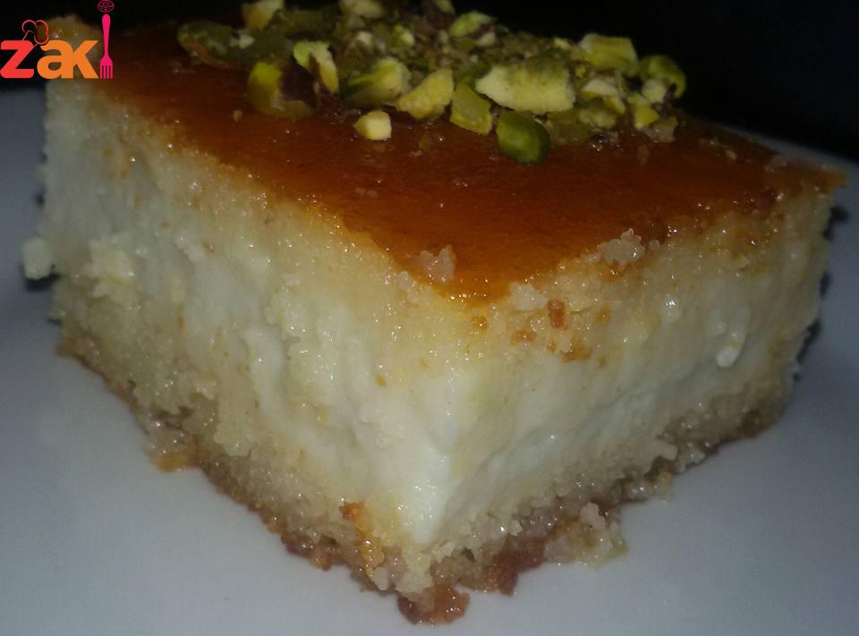 بيضتين ومعلقة ص فانيلا ونص كاسه كبيره سكر وبنخفق وبنحط نص كاسه زيت ونص كاسة حليب بودره وعلبة قشطه وبنخفق وبنضيف عليهم كاسه سميد ناعم مع معلقه كبيره بيكنج باودر وفنجان صغير حليب سائل وبنحرك بندهن صينيه طحينيه وبنحط نص الخلطه أو أقل من نصها وبنخبزها بالفرن من تحت لتستوي وبنسقيها شويه قطر بس تستوي