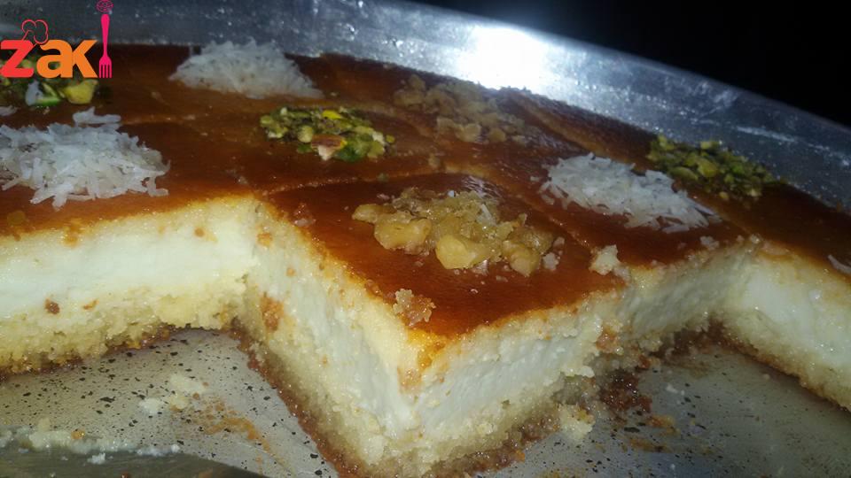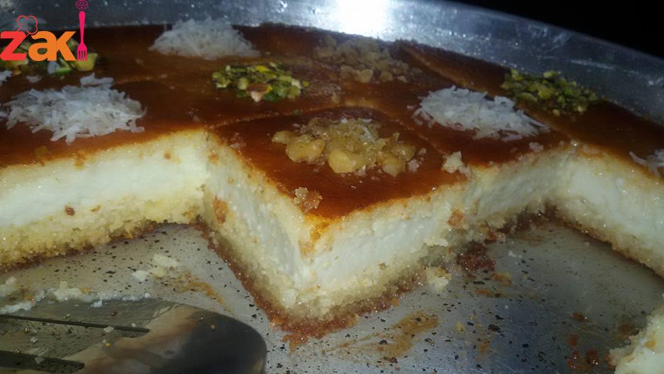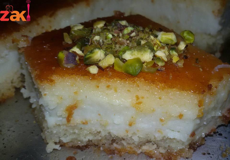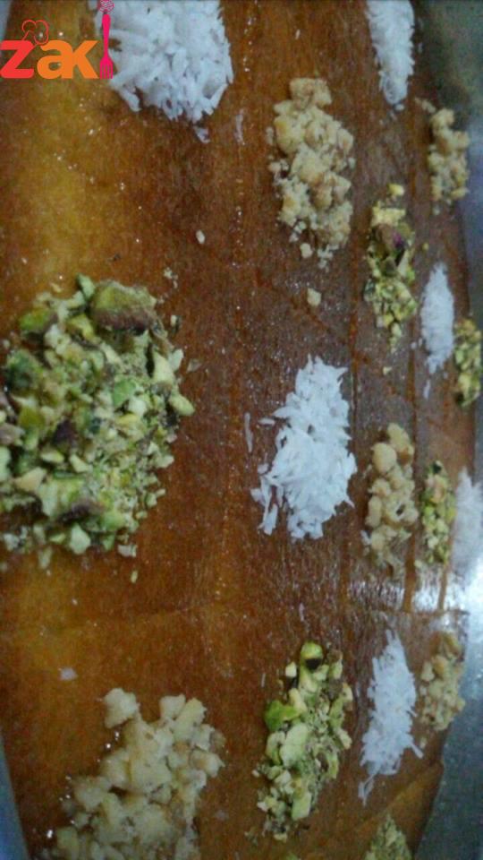 وبنحطه فوق اول طبقه وبنتركها 5 دقايق تبرد شوي وبنحط باقي الخلطه ازا شفتوهاجامده حطو شوية حليب سائل عليها…وبنولع الفرن من فوق وبنحط الصينيه بأرض الفرن تستوي ع مهلها وتتحمر وبنسقيها قطر بارد وبنرش فستق حلبي وجوز هند