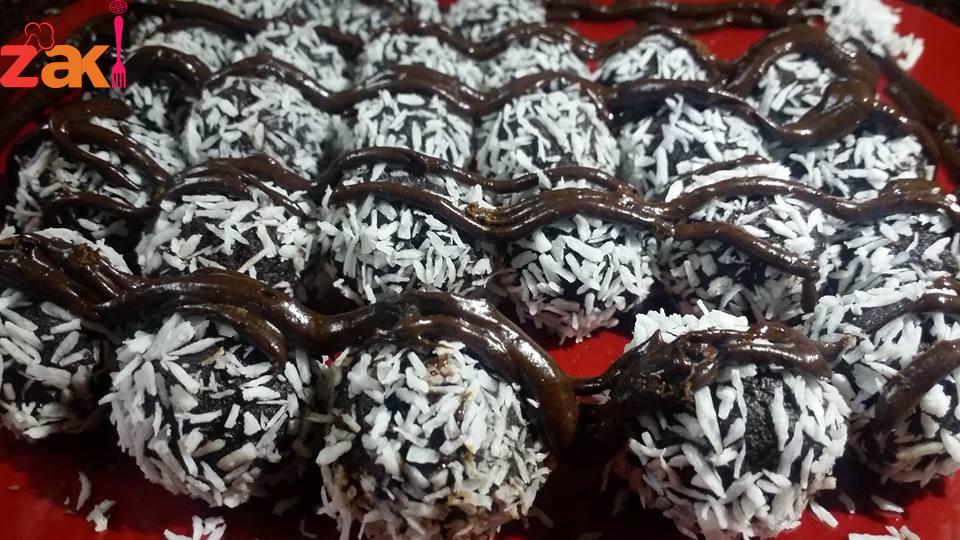 كيك امريكانا او كيك بايت عندك زيادة علبة قشطه معلقيتن كاكاو معلقيتن جوز هند بتفتفي الكيك منيح لحتى يسير ناعم بتحطي عليه الكاكاو وجوز الهند وحطي القشطه وحركيهم منيح حتى تصير عجينه تقدري تكوريها