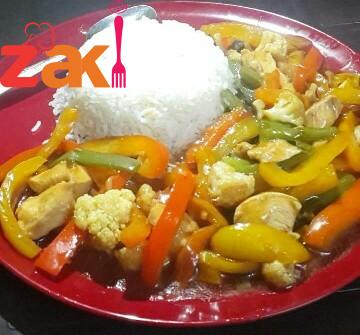 بنجيب صنيه تفال وينحطها ع نار وبنحط مقدار 3 معالق زيت ذرة وبعدها بنقلب البصل وبنحط الفطر والجاج وبنقلبهم منيح وبعدها الزهرة وبنقلب شوي وبنحط الفليفه بنذبلها شوي بس وبنحط الدرة واخر شي بتحطي الصويا وبتخليها دقيقتين وقبل الاكل بنحط النشا وصحه وانا عملت رز بسمتي مع هال ?