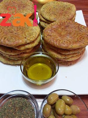 وعلى صواني الخبز مدهونه زيت على الرف اﻻول باعلى درجه حراره وانحمرها ولما تطلع ندهن الوجه زيت زيتون