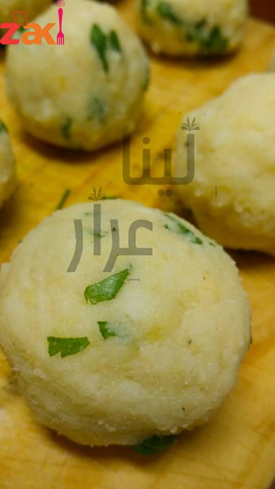 وبنسكرها عشكل كرة دائرية. بصحن بنخفق 2 بيضة مع رشة كزبرة ناشفة، بنغسط كرات البطاطا بالبيض ثم بالبقسماط ويقلى بزيت متوسط الحرارة لحتى يشقر وصحة والف هنا.