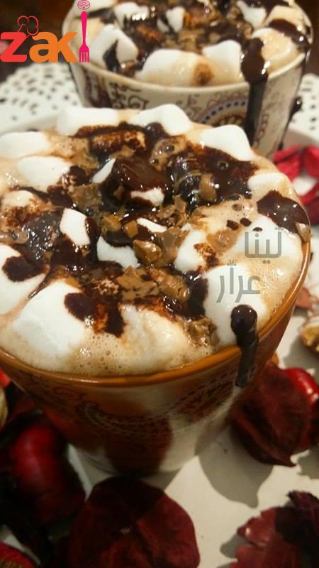 بنسكب الحليب على خليط الكاكاو وبنحليه حسب الرغبة وبنزينو حسب الرغبة ( انا زينتو بالمارشميلو ونفس خليط الكاكاو والشوكولاتة الخام اللي حطيناه باسفل الكوب ) وصحة والف هنا