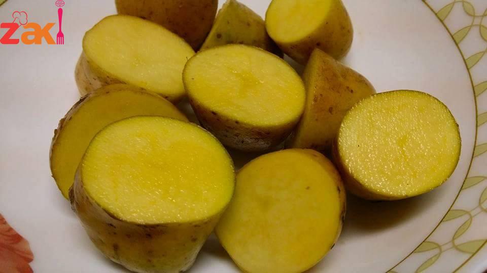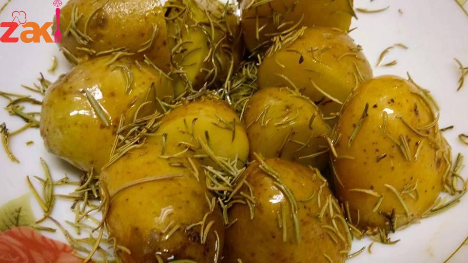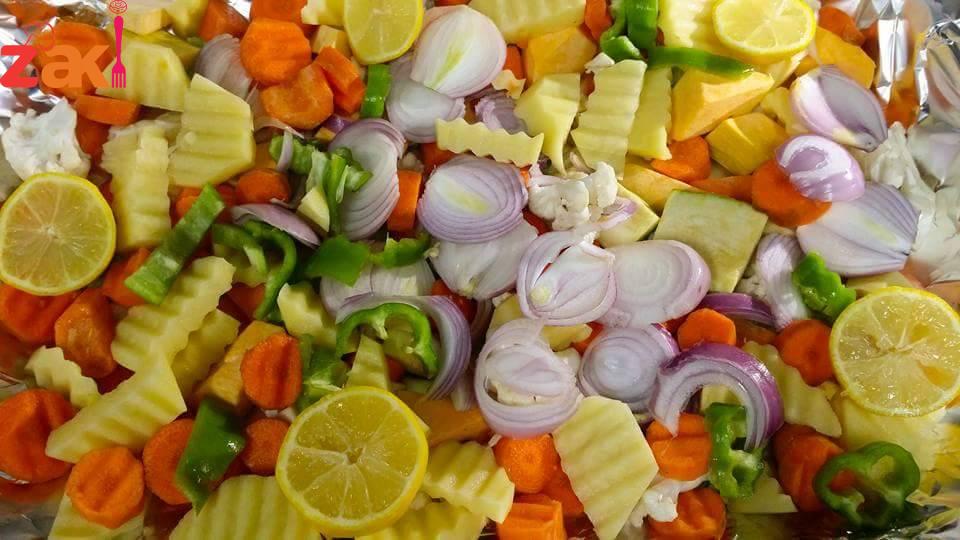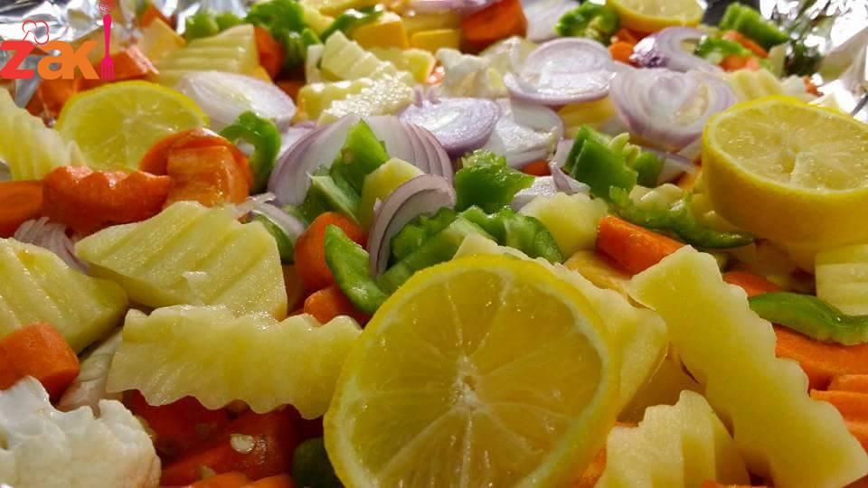 بنغلف اسفل الصينية بالقصدير وبنحط الخضار المتوفرة ( كوسا، بصل، فليفلة،بطاطا،جزر،فاصوليا،زهرة،يقطين ) مع شرائح ليمون دائرية وبنحط راس ثوم جوا قصدير وبنحطهم ع الخضار بنجيب بطاطا حجم صغير بنغسلهم منيح وبنقسمهم من النص ،
