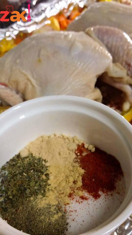 بنخلط البهارات التالية (ملح، فلفل اسود،بابريكا،ريحان بنخلطهم مع زيت زيتون وعصير ليمونة وبنخلطهم منيح وبندهن فيهن الجاجة من جوا وبرة وتحت الجلد ،