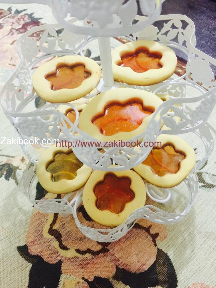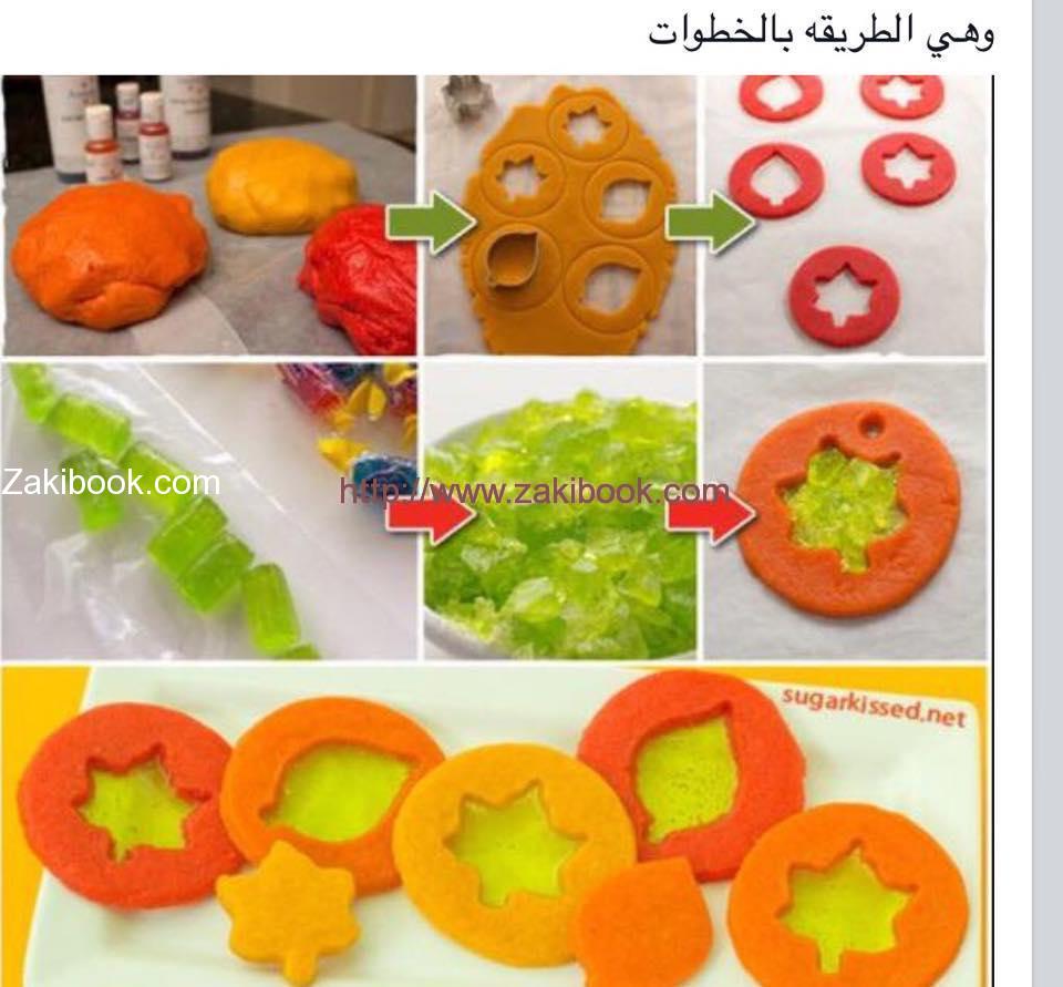 – تفرد العجينة بمدلك ( أو النشابة وهي أداة من لفرد العجين) فوق رخامة أو طاولة ، ويجب أن لا تفرد رقيقة جدا ، ونشكلها بالقطاعات الخاصة بالبسكويت ، ويكون عندك مقاسين ذات الشكل الصغير والآخر ذات الشكل الأكبر منه ،المقاس الكبير تقطعين به الشكل الخارجي للبسكويت ، والمقاس الأصغر لنفرغ البسكوت من النصف كما في الصورة التي توضح الأمر ، ونحطهم فوق صينية مغلفة بورق زبدة ، وفي نصف البسكويت المكان الفارغ نضع حبة سكاكر أو قطعة ملبس، ثم ندخلها للفرن الساخن حتى تتحمرالأطراف ، ويتغير لونهم ، وتذوب السكاكر، وتخرج الصينية من الفرن ،ولا نرفعهم من الصينية حتى يبرد البسكويت تماما ،لكي لا يتكسر ويخرب شكل البسكويت .