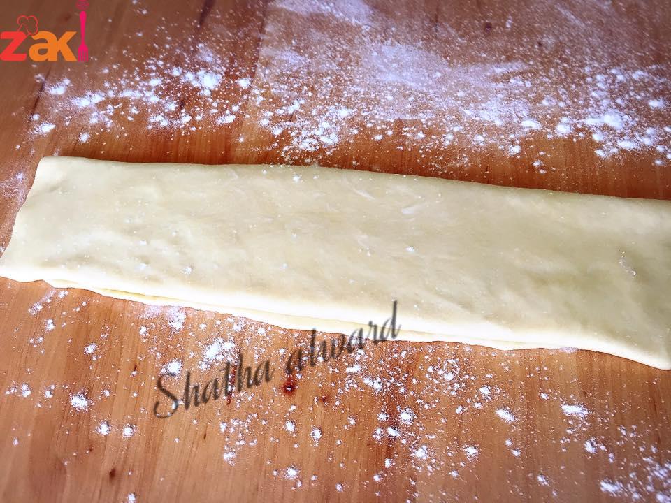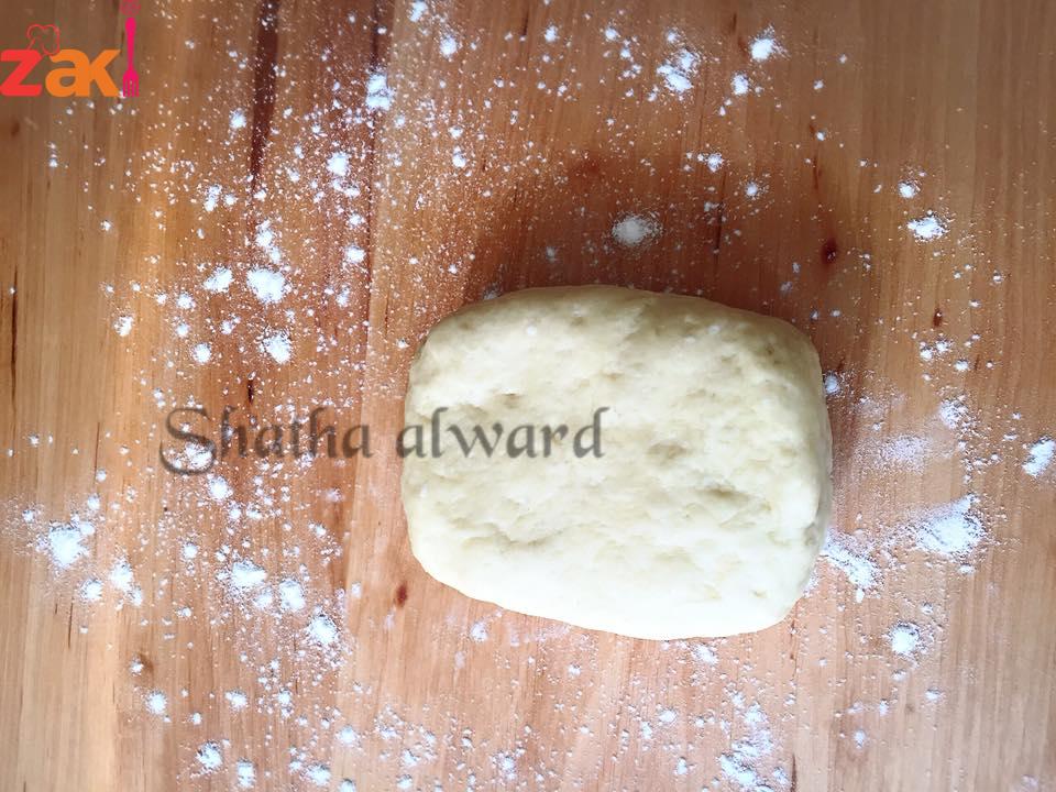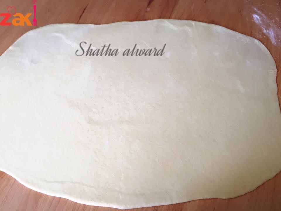 ثم توضع في وعاء مدهون بنقطة زيت وتوضع في مكان دافي تترك تختمر ثم تفرد بشكل مربع كبير ع سطح مرشوش دقيق
