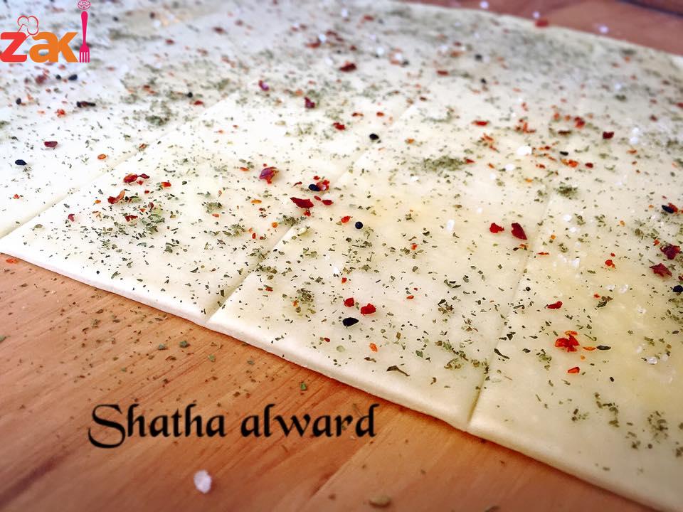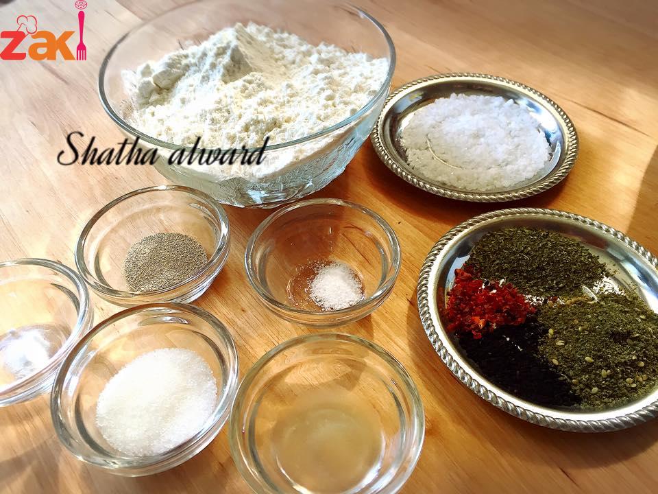 ملح خشن وتوابل ،،زعتر شطة نعناع جاف اي توابل حسب الرغبه للرش ع سطح العجينه بعد الفرد ،،