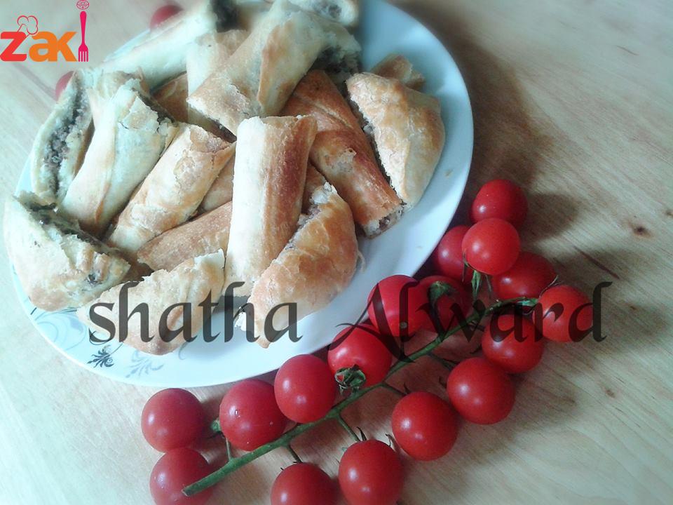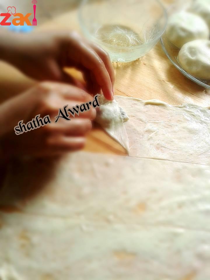 ملعقة خميرة وملعقة سكر في 3ارباع الكوب ماء نتركها شوية ونضيفها للدقيق ونعجنها اتركها ربع ساعة وبعدين اقطعها واخليها في صحن مملؤء زيت طبعا وافردها ع ميز او سطح مغطيته بالزيت وافردها بيدي لما تصير خفيفة اخلي حشوة والفهاا ..الطريقة حسب الي يعجبكم باللف انا قسم سويته بشكل بورك وقسم بشكل سمبوسة ..ودخلتها للفرن بعد الشوي تصير لذيذة ومقرمشة بشكل مو طبيعي ..