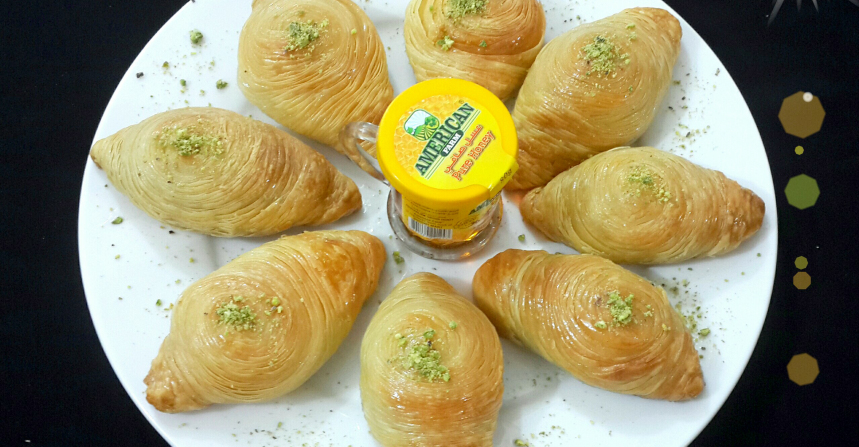 تخلط المواد الجافه معا والسائله معا وتضاف المواد السائله ع الطحين ويعجن يترك لمده 2 ساعه ليرتاح تقسم إلى 16 كوره وتفتح برشة نشأ وتوضع الطبقات واحده فوق الاخرى مع رشة نشأ بينهم تمد معا ع شكل دائره أم مستطيل كبير وتلف ع شكل رول وتقسم بعرض 1 أصبع وتفرد ع الطاوله وتحشى بالقشطه أو الجوز المطحون مع رشة قرفه وقطر وجوز هند وتغلق جيدا من الأسفل وتوضع ف صينية مدهونه وع فرن حامي مسبقا 180 كل 10 دقائق تخرج من الفرن وتمسح بالزبد تكرر العملية 3 مرات وفور خروجها من الفرن تسقى بالشربات أو القطر وتزين بالفستق