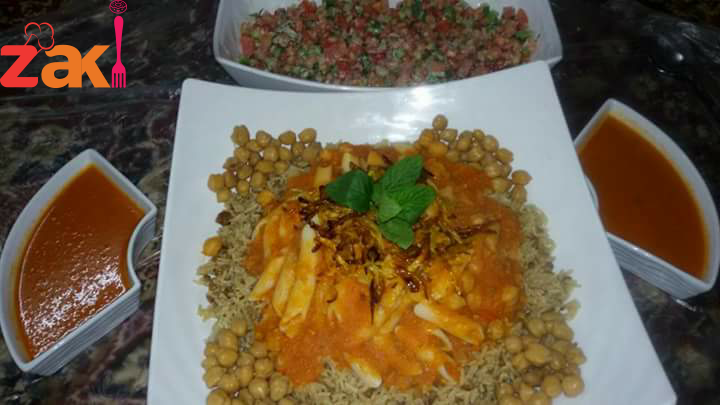 في طبق التقديم نضع الأرز مع العدس ثم الحمص ونضع الصلصة فوقة مع المعكرونة والبصل الجوانح