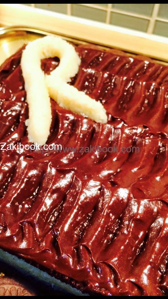 – نضيف الحليب إلى طنجرة ونضعها على النار و نضيف السكر حتى الذوبان ثم نضيف الجوز هند وعندما يسمك المزيج نضيف علبة قشطة و نحرك ونصب المزيج فوق الكيك ساخنا ( الاثنين ساخنين ).