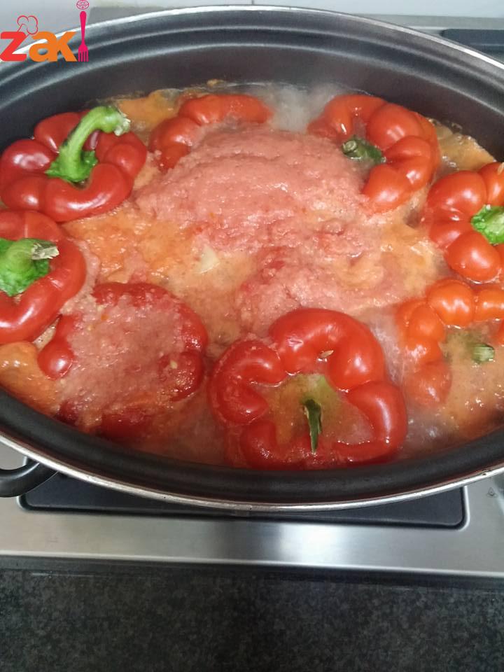 نطحن البصله مع الثوم والبندوره في محضرة الطعام حتى تنعم جيدا. ثم تضاف على الفليفله نضع ماء على ارتفاع نصف حبات الفليفله مع اضافة الصويا ودبس الرمان ومعجون الطماطم والملح والبهارات والحبق ونتركهم حتي النضج بعدها ندخلهم الي الفرن لتحمير الوجه.