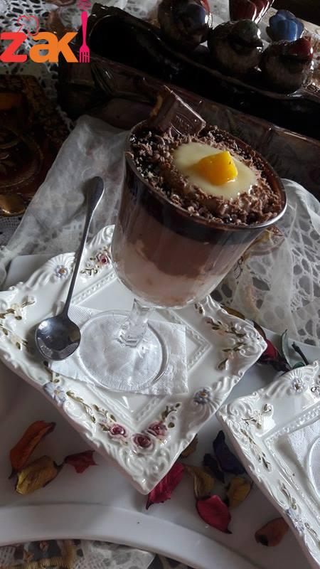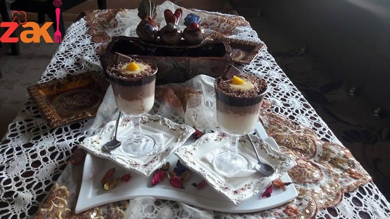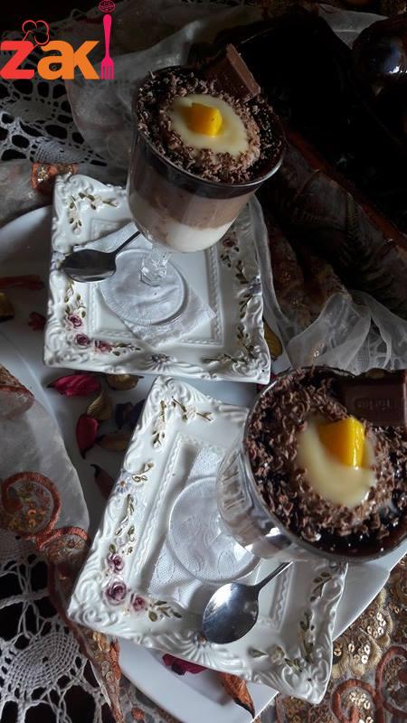 يضافالدقيق ويقلب مع الزيت ع نار خفيفه حتى يصبح رائحته زكيه ومن تم نضيف الماء المدوب بالحليب وعند الغليان تضاء الفانيلا يقسم الخليط الى ٣ اقسام .. نكهة الفانيلا الاولى . الثانية يضاف النسكافيه والثالثه الكاكاو البودره … يوضع بين كل طبقه القليل من البسكويت المطحون وتوضع بالبراد حتى تبرد وللتزيين جلاكسي مبشوره والقليل من الفواكه الطازجه حسب الرغبه.وهنيئا
