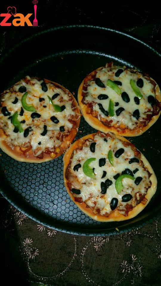 عجينة عادية 2كاسة طحين و2 ملعقة حليب و1سكر ورشة ملح وبيضة و2ملعقة زيت وملعقة خميرة اما الحشوة فهي بصل شرحات وفليلفلة شرحات وفطر وذرة وبندورة عالنار حتى يتماسكوا اضع كتشب وصوص بيتزا ثم اضعهم عالعجينة واضع مازارولا وزيتون وفليفلة وزعتر بيتزا