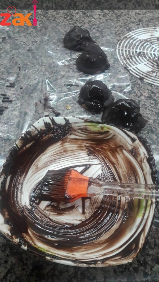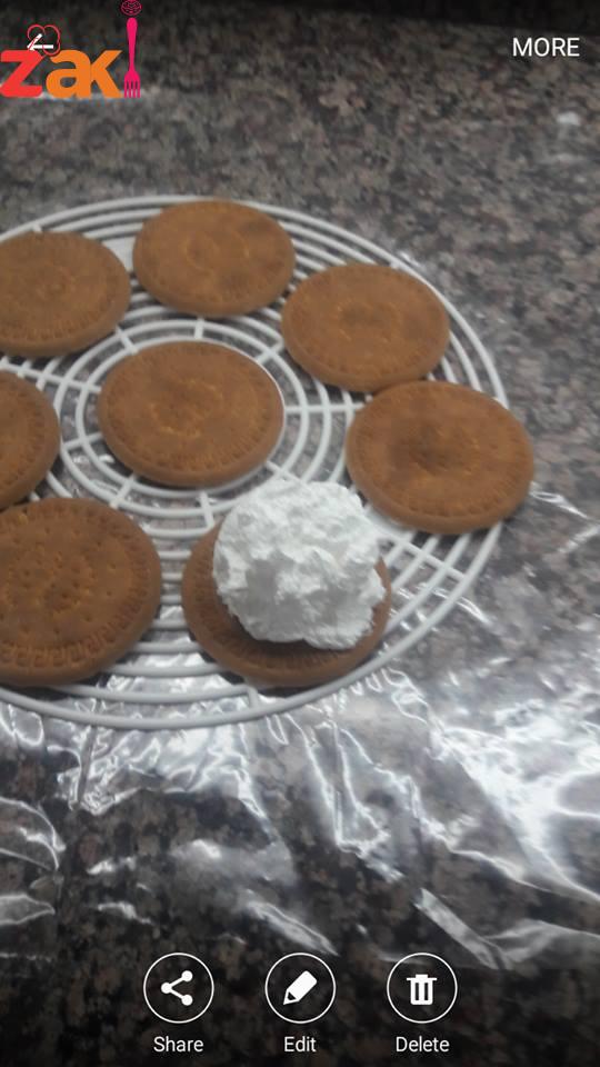 التحضير : نضع البسكوت على شبكة وملعقة كريما عليها بشكل هرم . نذوب 200غ شوكولا مع 100 غ زبدة وبالفرشاة نغلف الكريما اول مرة وعندما يجمد نعيد تغليفه مرة ثانية